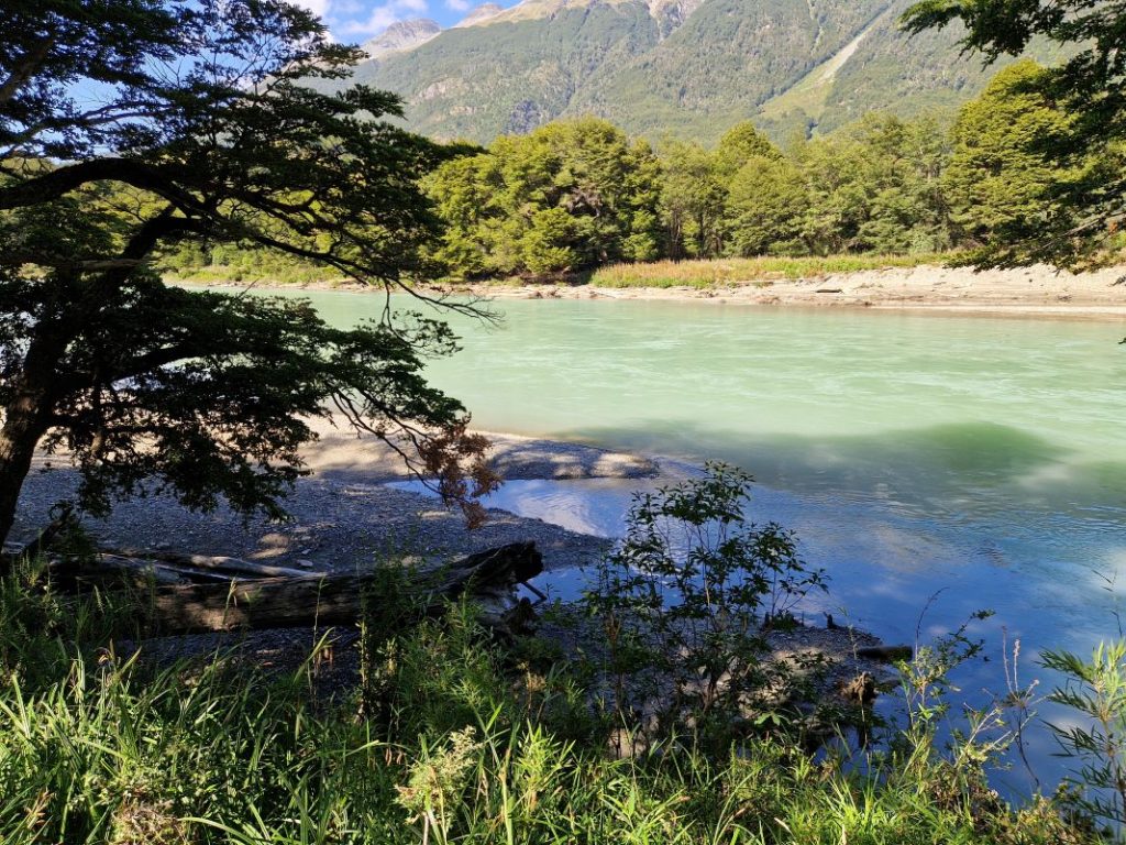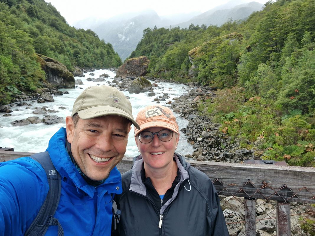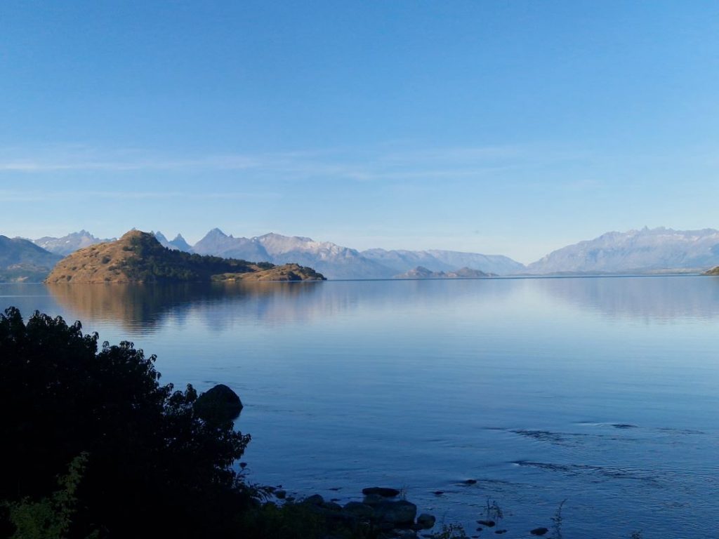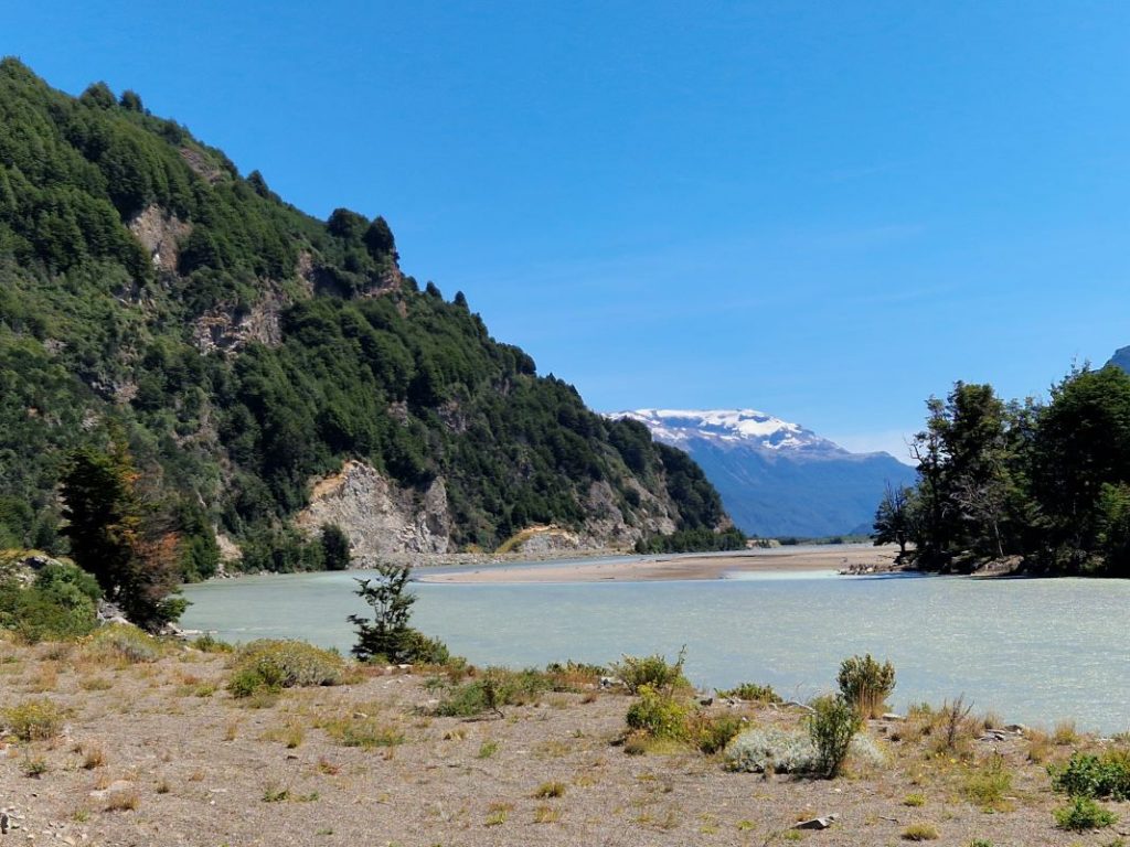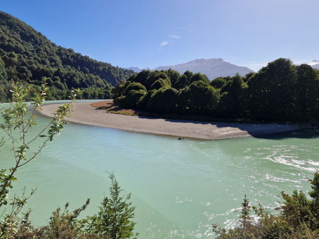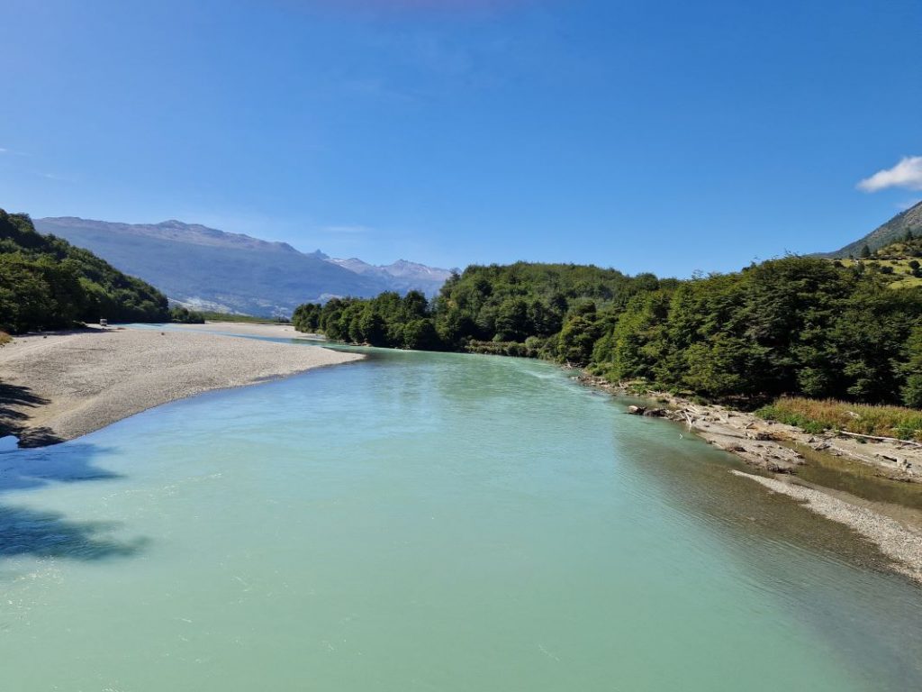 Uns tut die Bewegung gut. Nicht zuletzt, weil wir uns ein paar Stunden später in dem Fischerdörfchen Puyuhuapi mit leckerem Kaffee und Kuchen belohnen werden (Pflaumenkuchen für Patricia und Tiramisutorte für Christian). Aufgrund der vielen deutschsprachigen Einwanderer hat das Wort „Kuchen“ Eingang in den chilenischen Sprachschatz gefunden. Überall auf den Kreidetafeln an den Cafés sehen wir die heute frischgebackenen „Kuchen“ beworben. Eine gute Stunde weiter finden wir am Zusammenfluss von Río Oeste und Río Frio bei Villa Vanguardia einen einsamen Platz am Flussufer ganz für uns alleine. Hähne krähen irgendwo in der Ferne und am anderen Flussufer grasen Schafe und Kühe.