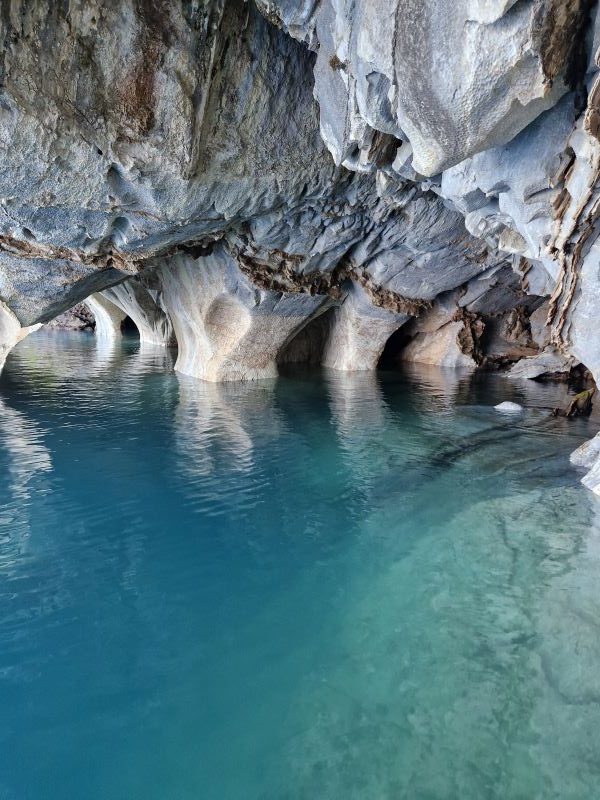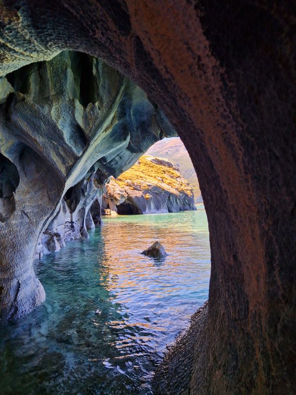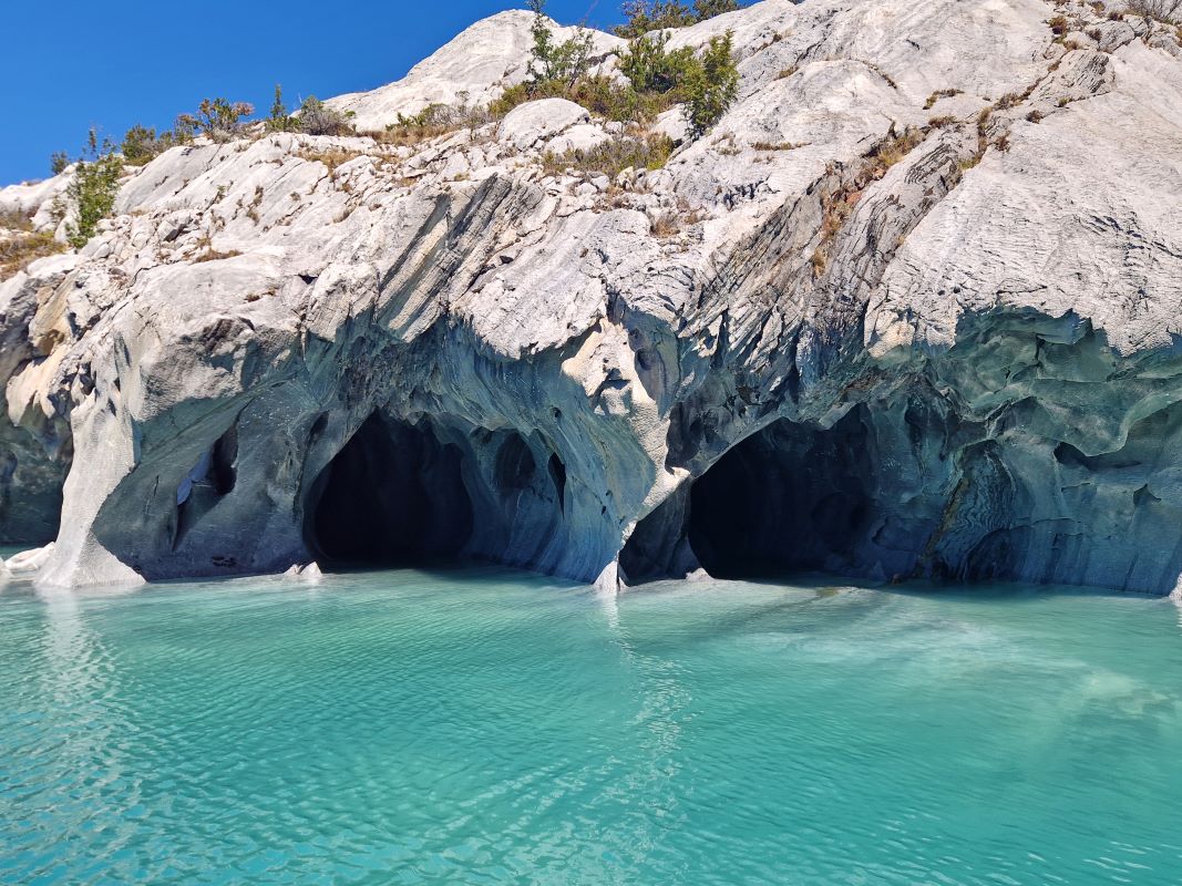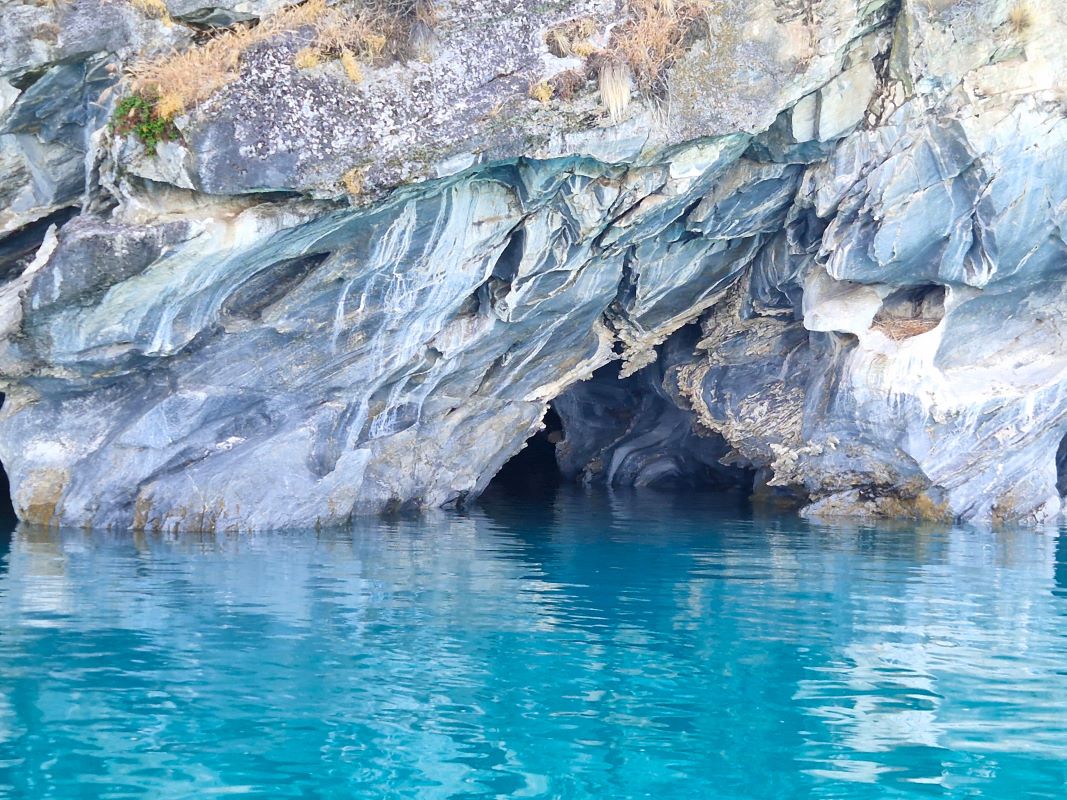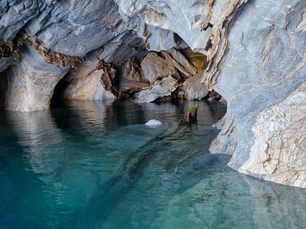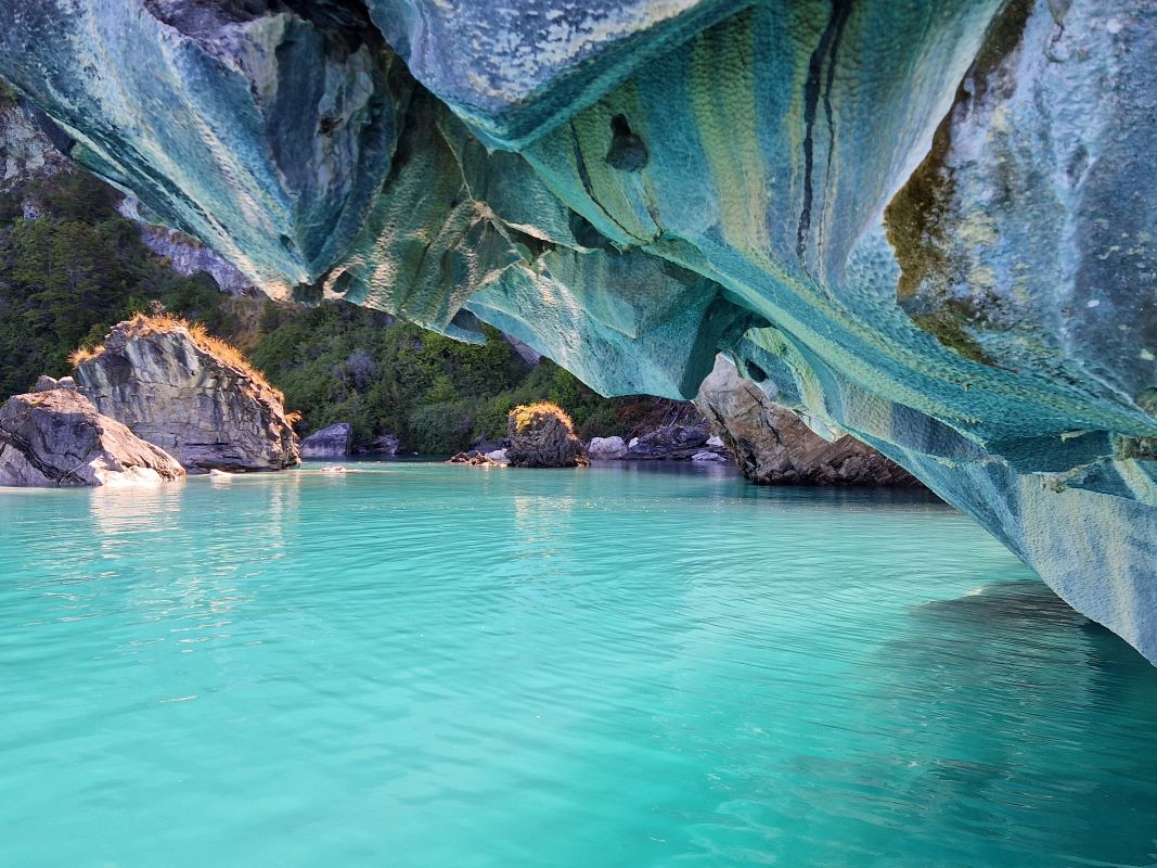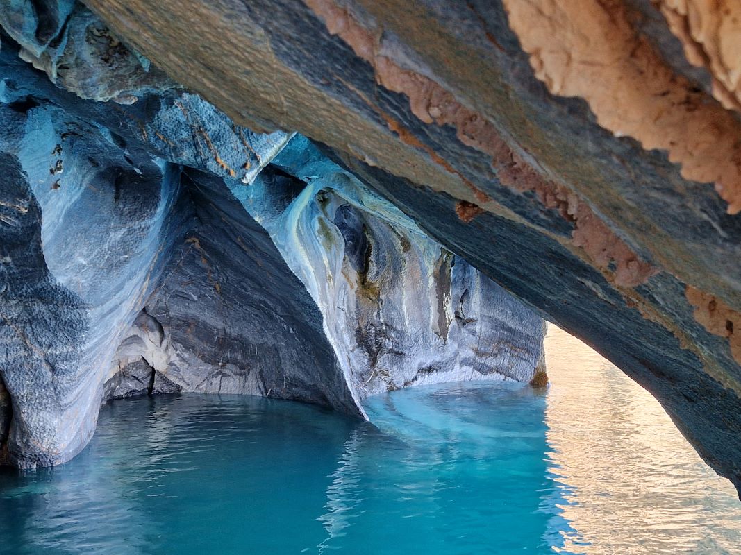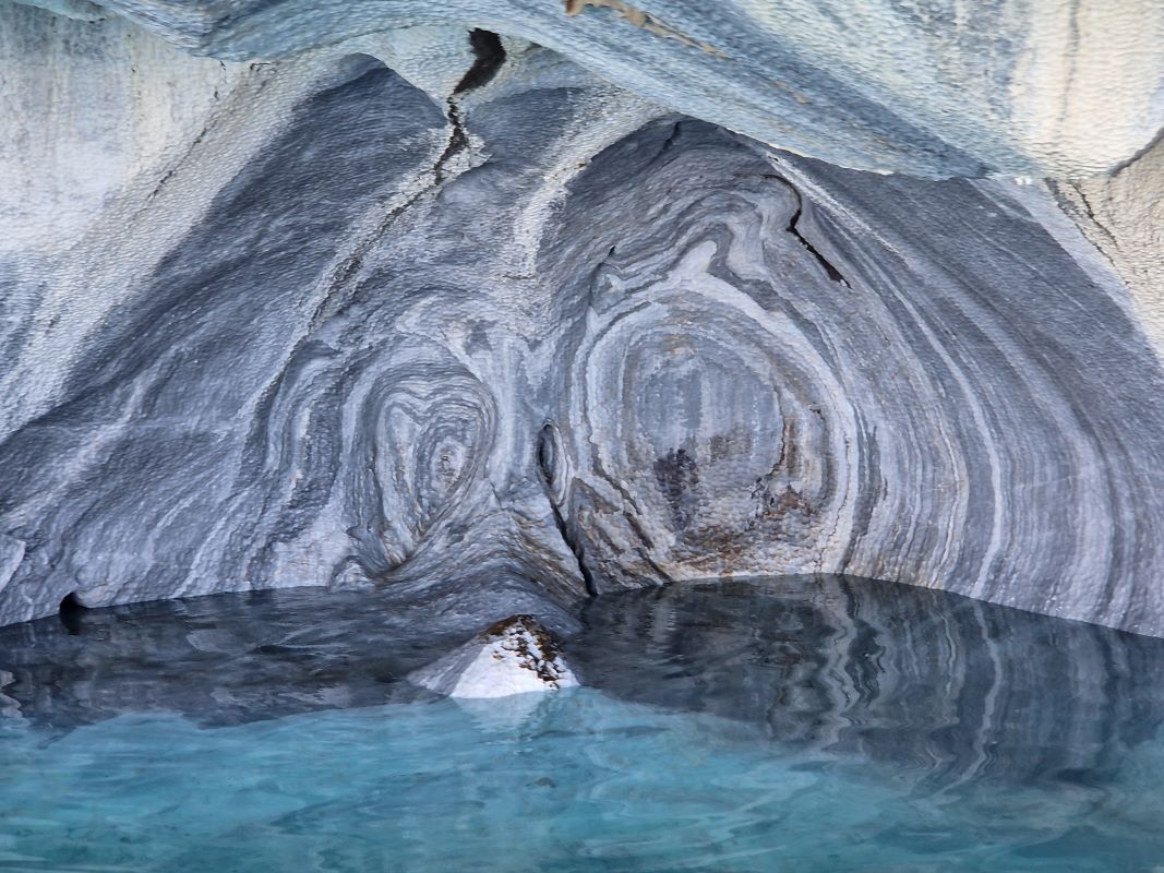 Die Kalksteinformationen sind so einzigartig, dass sie als Santuario de la Naturaleza, als Naturdenkmal, geschützt werden. Über 3 Millionen Jahre haben die Wassermassen des Sees den Kalkstein ausgehöhlt, geformt und poliert und dabei rosa, grauweiße und blaue Marmoradern freigelegt. Die glatt geschliffenen, vielfach strukturierten Marmorwände spiegeln sich im Grün des Wassers in türkisblauen, eisgrünen und funkelnden weißen Strukturen. Da die Wellen nicht so hoch schwappen, fahren wir mit unserem Boot auch in die ein oder andere Höhle hinein und können die feuchten Marmorwände mit unseren eigenen Händen erfühlen. Auch dieses Naturschauspiel geht auf die vielen seinerzeit aktiven Vulkane zurück. Stark schwefelhaltige Niederschläge ließen die Gewässer gewissermaßen versauern und so hat sich das Wasser über Jahrmillionen in die Marmoradern buchstäblich hineingefressen. Heutzutage ist dieser Prozess zum Stillstand gekommen. Keine aktiven Vulkane mehr, ph-neutrales-Wasser, keine Kalksteinauflösung.