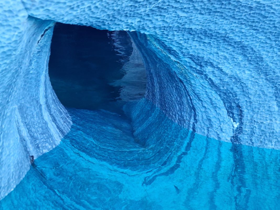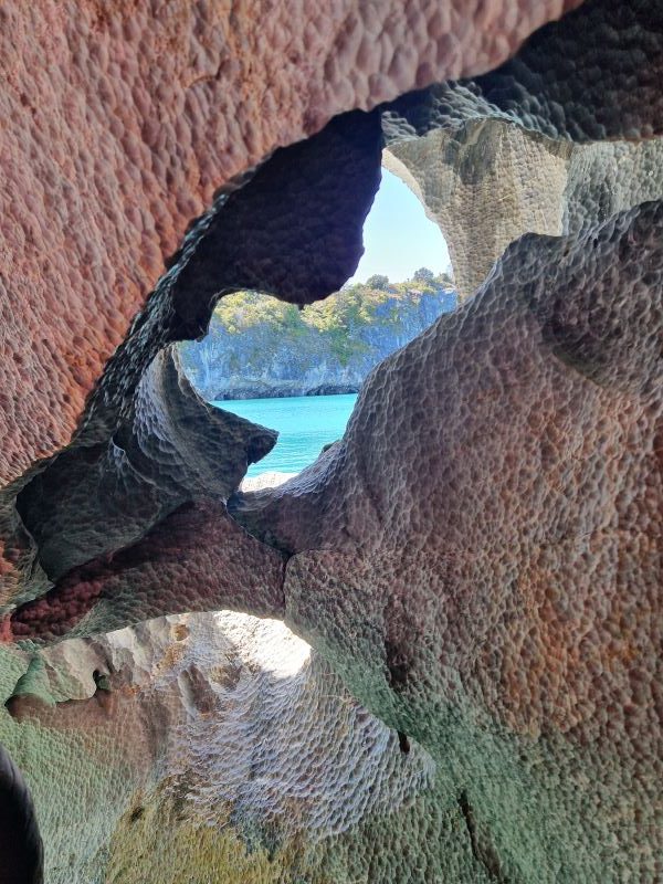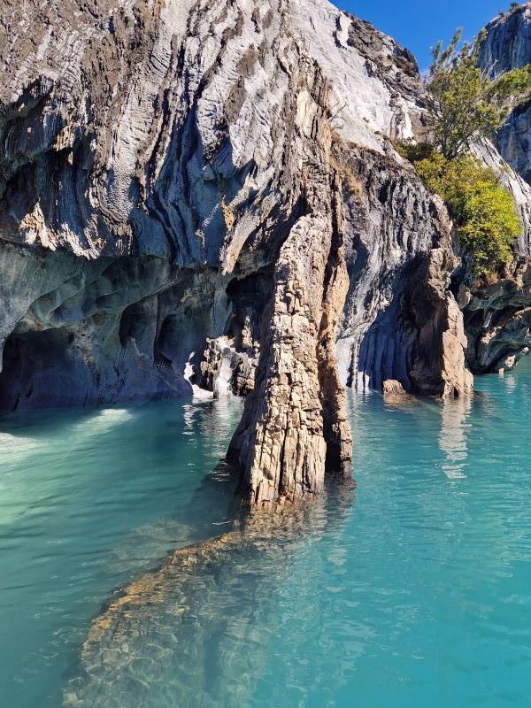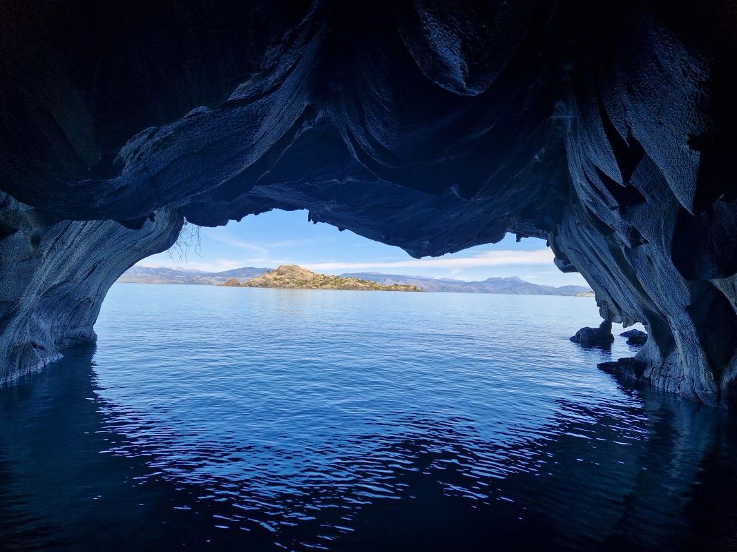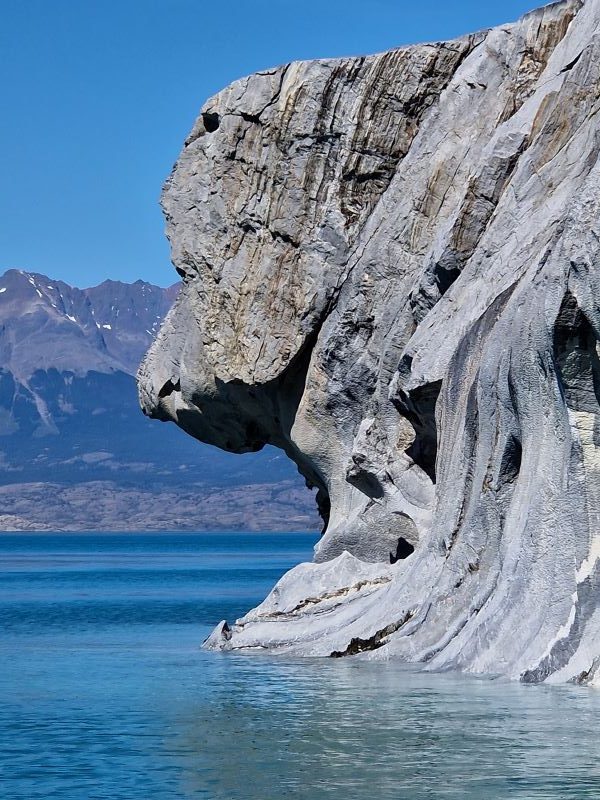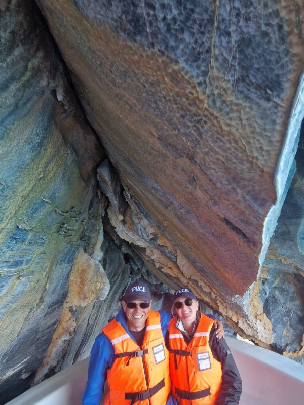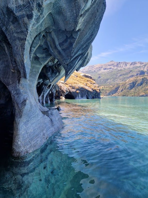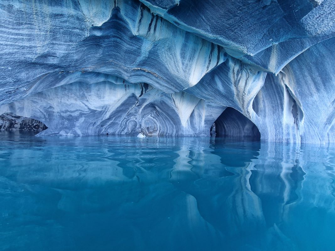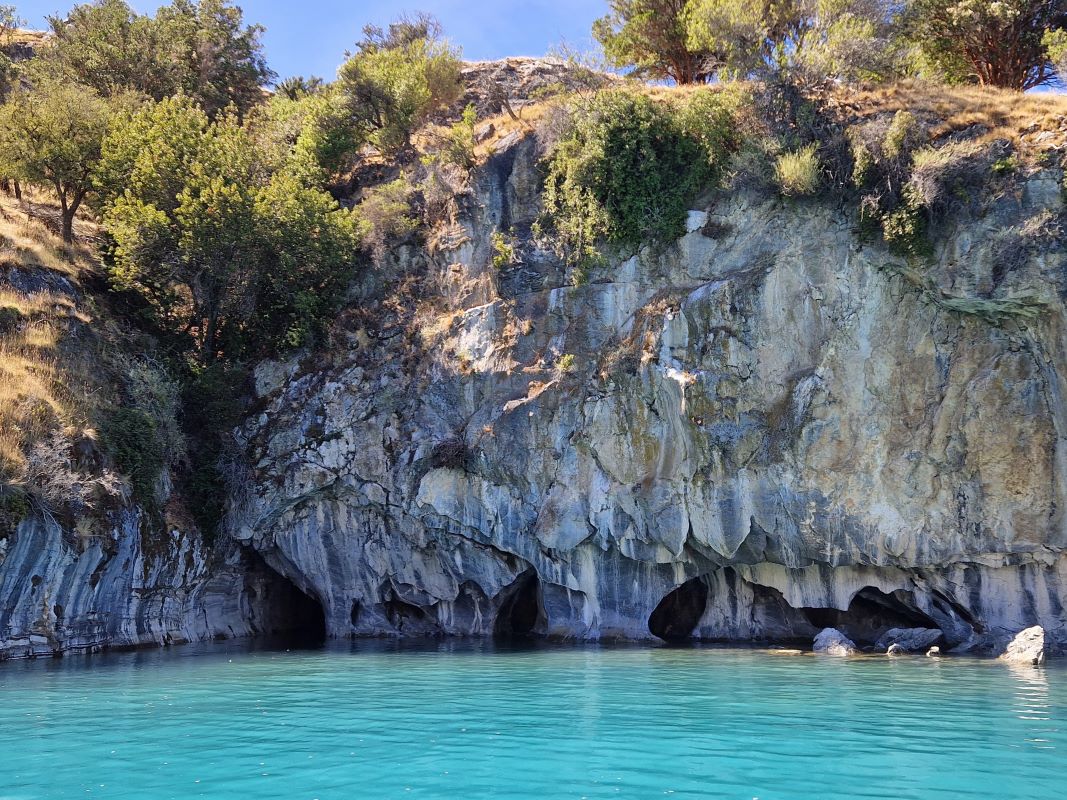 Die Kalksteinformationen sind so einzigartig, dass sie als Santuario de la Naturaleza, als Naturdenkmal, geschützt werden. Über 3 Millionen Jahre haben die Wassermassen des Sees den Kalkstein ausgehöhlt, geformt und poliert und dabei rosa, grauweiße und blaue Marmoradern freigelegt. Die glatt geschliffenen, vielfach strukturierten Marmorwände spiegeln sich im Grün des Wassers in türkisblauen, eisgrünen und funkelnden weißen Strukturen. Da die Wellen nicht so hoch schwappen, fahren wir mit unserem Boot auch in die ein oder andere Höhle hinein und können die feuchten Marmorwände mit unseren eigenen Händen erfühlen. Auch dieses Naturschauspiel geht auf die vielen seinerzeit aktiven Vulkane zurück. Stark schwefelhaltige Niederschläge ließen die Gewässer gewissermaßen versauern und so hat sich das Wasser über Jahrmillionen in die Marmoradern buchstäblich hineingefressen. Heutzutage ist dieser Prozess zum Stillstand gekommen. Keine aktiven Vulkane mehr, ph-neutrales-Wasser, keine Kalksteinauflösung.