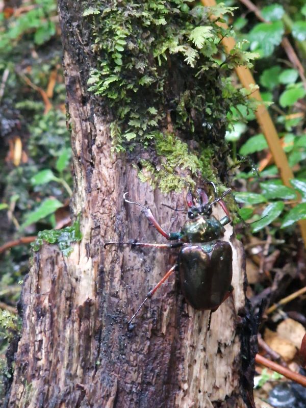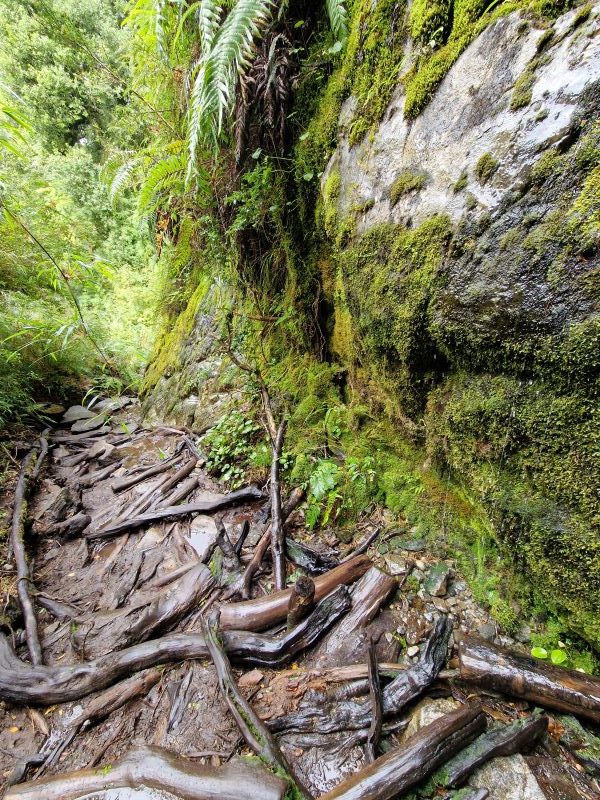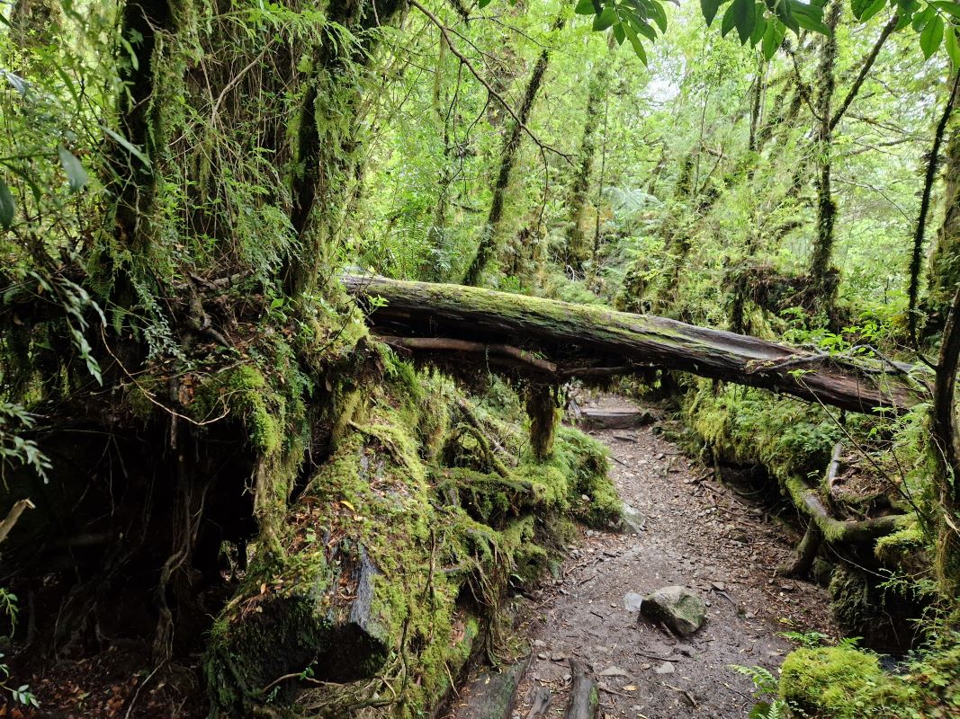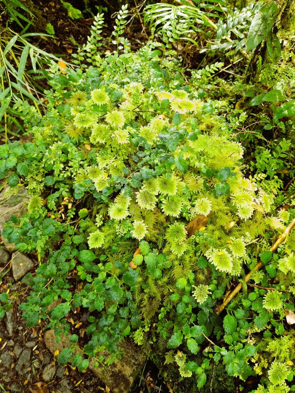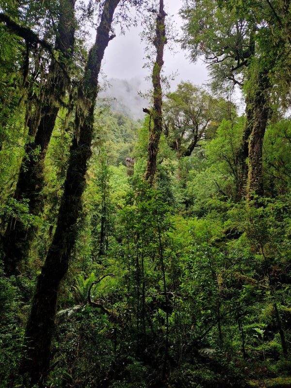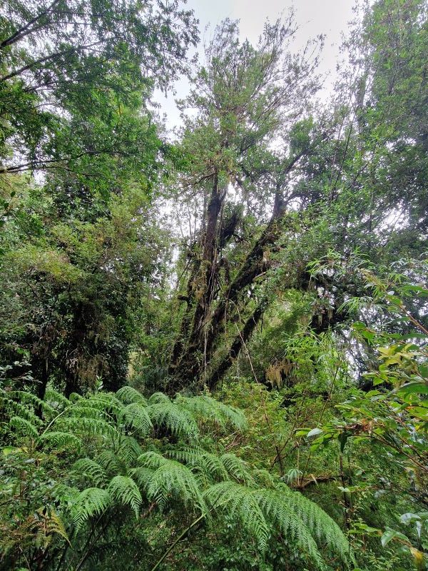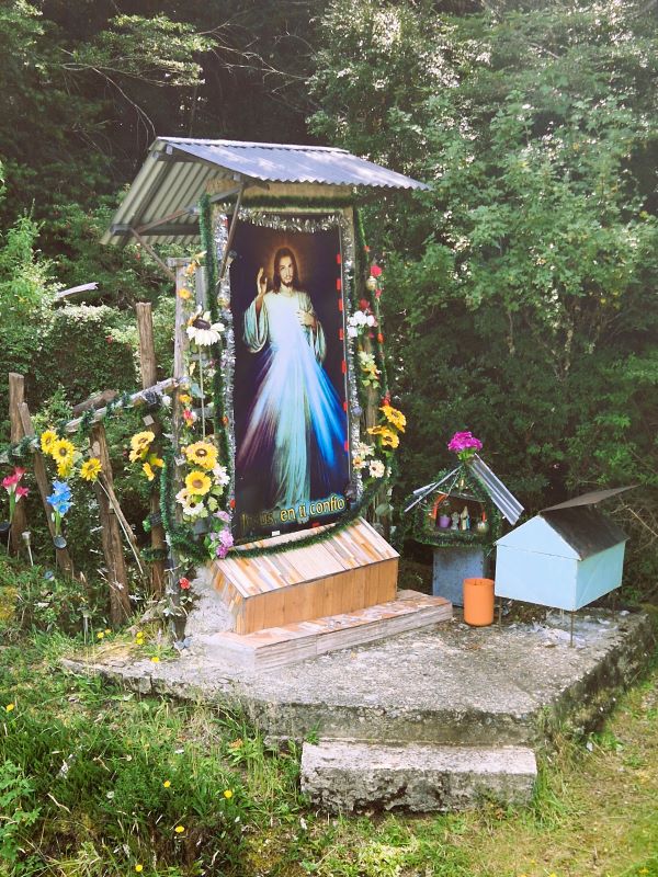 Tja, wer hochfährt, muss auch irgendwann wieder runter. Hinter dem Pass beginnt dann das Abenteuer. Zuerst hört der Asphalt auf. Willkommen zurück auf Schotter und Staub. Und dann geht es in wilden Haarnadelkurven an der steilen Bergflanke entlang durch einen Zauber-Dschungel-Wald in die Tiefe. Wir bitten um den Beistand aller Heiligen, dass alles gut geht. Denn durch die z.T. mehr-als-180°-Kurven führt der Weg nicht eben (also waagrecht) hindurch, sondern folgt manchmal dem Berggefälle. Unser Wagen lehnt sich gefährlich schräg ins Tal. Erst im zweiten Gang Allrad schafft der Motor die nötige Bremswirkung (Motorbremse) und wir hoppeln mit gedrückten Daumen nach unten. Glücklicherweise ist es trocken, sonst wäre dieser Weg für uns schlecht passierbar. Von diesem Streckenverlauf haben wir ein Foto vom Navibildschirm gemacht…muss man mal gesehen haben. Und wieder kommt uns der Gedanke an die Carretera-Austral-Fahrradfahrer, die auch diesen Berg erklimmen müssen.