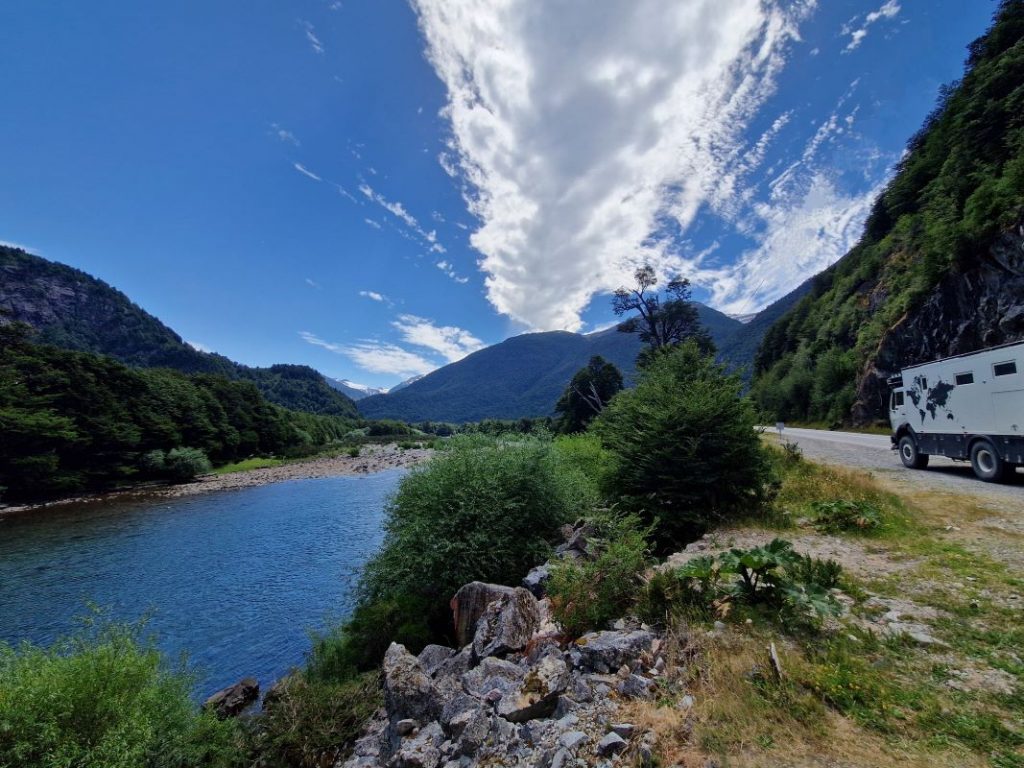 In der einzigen, wirklich größeren Stadt entlang der Carretera, Coyhaique, machen wir nur einen kurzen Versorgungsstopp beim Supermercado Unimarc, Friseur für Christian (wird langsam zur Routine) und einem Reifenluftdruckcheck bei der örtlichen Mercedes-Benz-Niederlassung (wenn schon Luft, dann wenigstens vom Markenhersteller!). Danach geht es ins Valle Río Simpson zu Nacho auf seinen kleinen Campingplatz „Las Torres del Río Simpson camping y refugio “, von dem wir in der iOverlander-App gelesen haben.