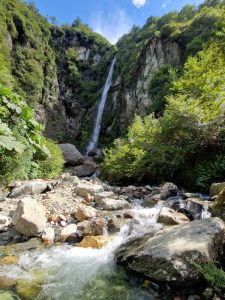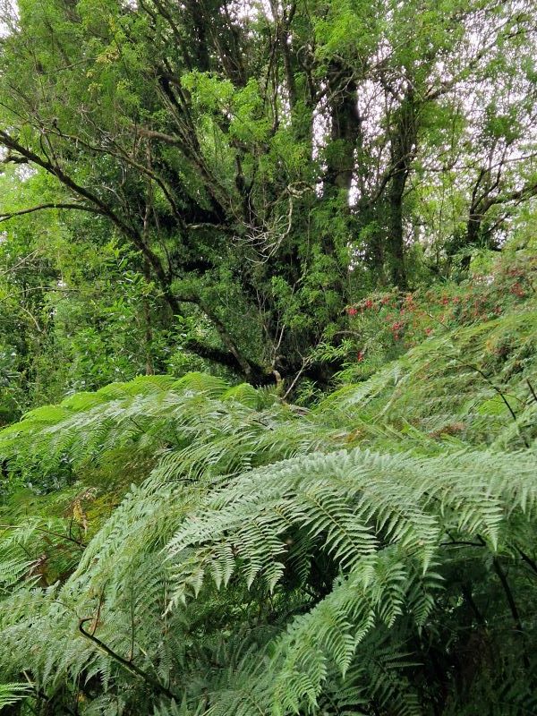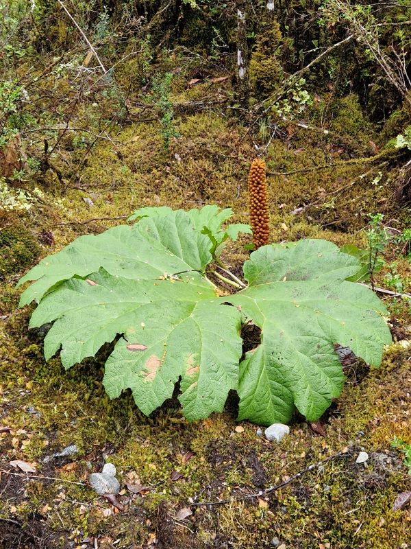 Kurz vor unserem Tagesziel an den Ufern des Pazifik in der Nähe des Parque Nacional Queulat gilt es aber noch eine Meisterleistung des Straßenbaus zu überwinden. Zum Pass beim Wasserfall Salto El Condor geht es so steil bergauf (dankenswerterweise auf Asphalt bzw. Beton), dass streckenweise ein Zusatzbelag zur Reifenhaftungsverbesserung aufgebracht ist. Ähnlich dem, den man bei uns auf Holztreppen im Freien sehen kann. Meist im zweiten Gang Vollgas erklimmen wir den Bergrücken. Am kleinen Parkplatz des Salto El Condor gönnen wir unserem PuCe eine Verschnaufpause. Und uns den kurzen Spaziergang zu dem hohen Wasserfall. Überall um uns herum blühen die Fuchsienbüsche und die mannshohen Mammutblätter.