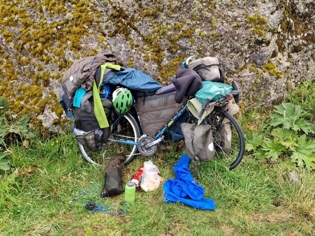 Einmal campiert Collin von der Isle of Man neben uns zwischen Bäumen unter einem aufgespannten Regentarp. Er und sein Fahrrad sind mit über 100kg (!) Gepäck beladen. Seit mehr als 5 Jahren ist er nun schon unterwegs; sein Geld verdient er als Komponist. Und so muss er seinen Synthesizer und was sonst noch alles an Equipment dazugehört eben auf seine Reise mitnehmen. Immer, wenn du glaubst, schon alles gesehen zu haben, kommt ein noch Verrückterer daher…