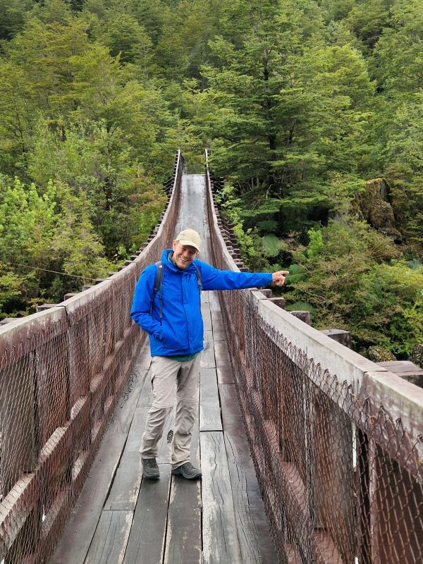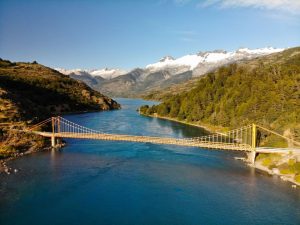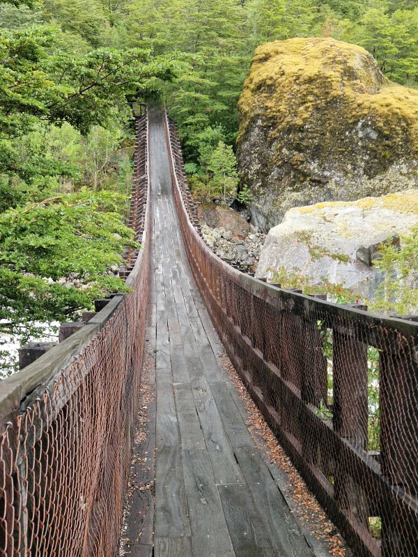 Kurz nach El Maitén überspannt eine rotorange schimmernde Hängebrücke aus Stahl, das chilenische Pendant zur Golden Gate Bridge, den Zusammenfluss des Lago General Carrera mit dem Lago Bertrand. Spontan entscheiden wir uns, unter bzw. neben der Brücke unser Nachtlager aufzuschlagen. Im Laufe der Fahrt werden wir noch viele weitere imposante Brücken überqueren und fotografieren. Manche fügen sich ganz grazil in die Landschaft ein, andere haben Ähnlichkeit mit Saiteninstrumenten, so fein wirken die Brückenspannseile.