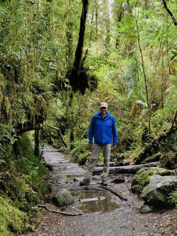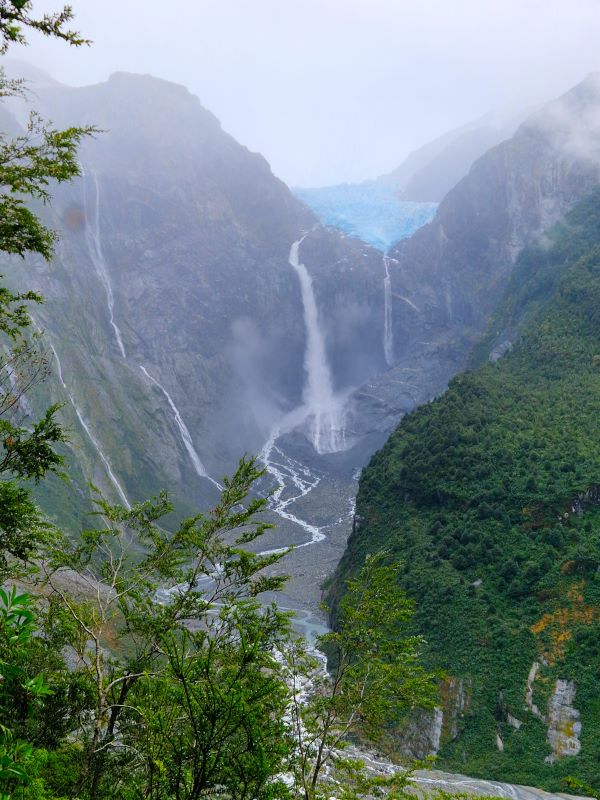 Da wir keine Online-Reservierung für den Eintritt zu dem kleinen Parque Nacional Queulat haben, stellen wir uns gleich bei Öffnung um 9 Uhr an die Schranke. Aufgrund des Naturschutzgedankens wird jeden Tag nur ein bestimmtes Kontigent an Besuchern zugelassen (daher besser vorher online buchen). Weil es gestern so mistig war, werden heute trotz Sonnenschein scheinbar nicht alle Angemeldeten erwartet und auch wir bekommen Zugang. Die touristische Attraktion des Parkes ist ein 10km langer Wanderweg durch einen dampfenden patagonischen Dschungel hinauf zu dem Mirador auf den Gletscher „Ventisquero Colgante“ (hängender oder klebender Gletscher) mit seinen tosenden Wasserfällen. Der Anblick des riesigen Schneefeldes, das wirklich wie an den Berg hingeklebt wirkt, ist berauschend. Die sommerliche Schneeschmelze speist große Wasserfälle, die unter dem Eis hervortreten und die fast senkrechten Hänge hinabstürzen.