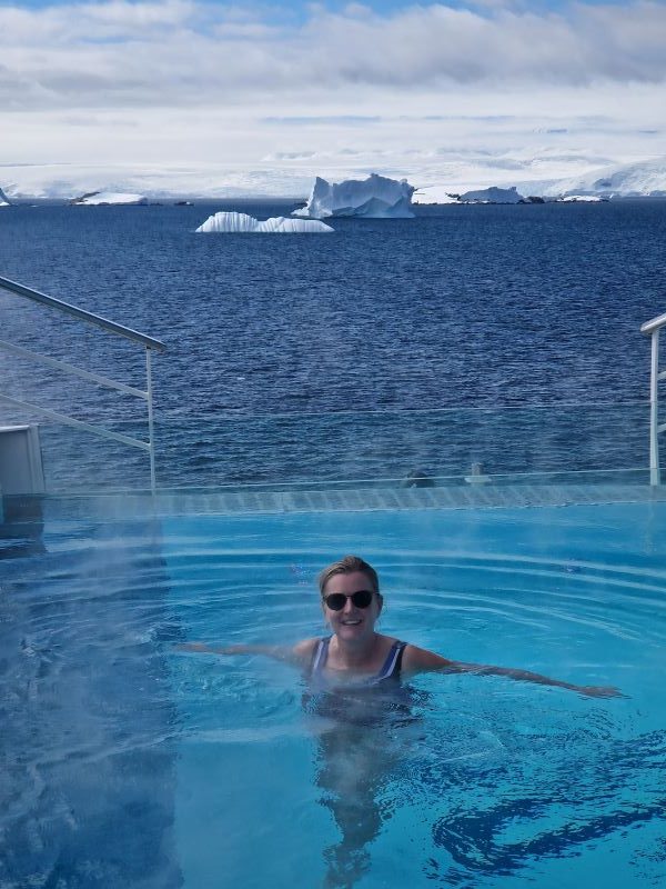 Auf einer Fahrt in die Antarktis darf eine Polartaufe natürlich nicht fehlen. Fünf von uns Achten haben sich in einem Anfall von Leichtsinn und Gruppendynamik für den „polar plunge“ angemeldet. So kommt es, dass wir an einem Nachmittag in Badeanzug/-hose und Bademantel gehüllt bibbernd an der Außenluke dem Sprung ins Eismeer entgegenfiebern; hoffentlich fiebern wir hinterher nicht weiter! Zur Sicherheit wird jeder Springer angeleint; Ohnmachtsanfälle kommen wohl schon mal vor. Patricia ist zuerst dran. Christian folgt danach. Jetzt gibt es kein Zurück mehr. Luft anhalten und mit einem weiten Sprung hinein in das -1° kalte, kristallklare Wasser. Platsch…wo ist oben…wo ist das Schiff…hurra, ich lebe noch… adrenalingepuscht fühlt es sich gar nicht so kalt an. Trotzdem lieber schnell wieder raus. Über eine Leiter klettern wir zurück an Bord und werden mit einem Glas Wodka empfangen (auf Nachfrage auch zwei). „Das müsst ihr trinken, wärmt von innen und beugt Erkältung vor.“ Also rein mit dem Stoff und sofort ab zum Freiluftpool achtern auf Deck 7. Im dampfend heißen Wasser wärmen wir uns wieder auf und lassen mit viel Gelächter das eben Erlebte nochmal Revue passieren. In der Rückschau war es sogar richtig gut. Und in der Gruppe macht so etwas natürlich noch viel mehr Spaß.