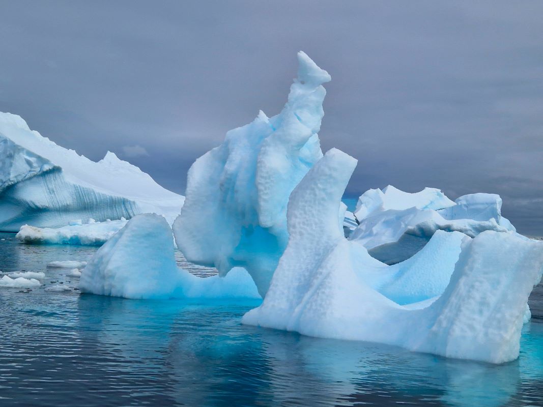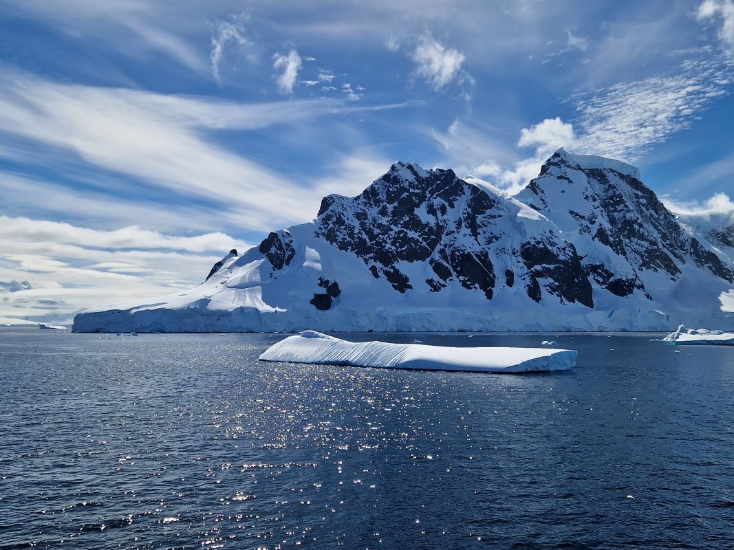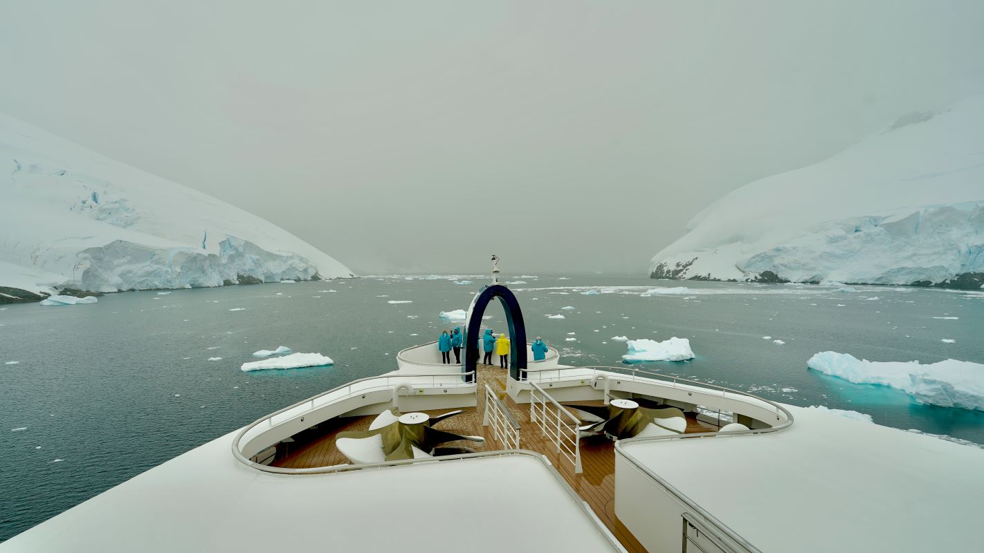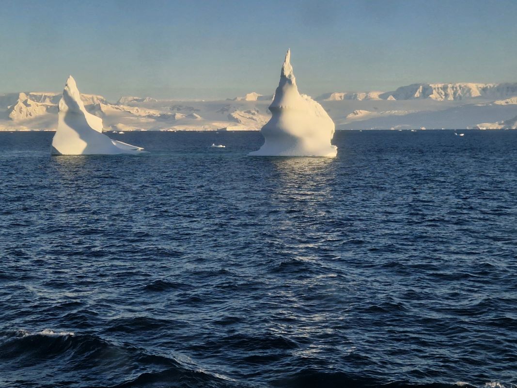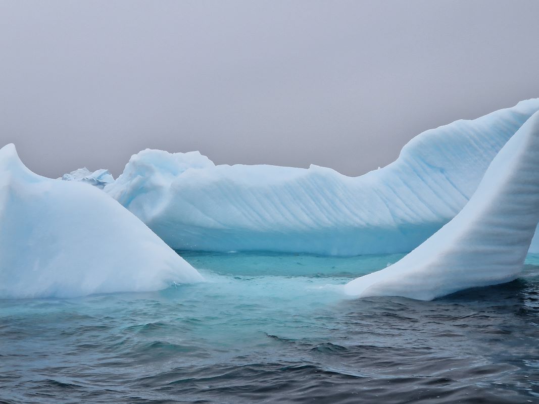 Am 31.12.23 gegen 17 Uhr dann die Sichtung des ersten Eisbergs. Dutzende Kameras klicken – mächtig und erhaben gleitet er auf unserer Steuerbordseite vorbei. Stille an Bord. Alle staunen gefesselt von dem Anblick. Und frieren an der Reling! Auf unserer Fahrt werden noch tausende weitere Eisberge auf uns warten. Und manche muss die Diana Bug voraus aufs Korn nehmen, weil links oder rechts davon kein Platz zum Darum-Herum-Navigieren ist. Denn in den zum Teil engen Passagen tummeln sich da nämlich noch größere. Manche zerbrechen mit lautem Knacken und Getöse, andere gleiten knirschend unter den Schiffsrumpf oder daran vorbei. Unser brandneues Schiff ist für genau solche Gewässer konstruiert und ausgelegt worden. Also kein Problem. Das Schicksal der Titanic wird uns erspart bleiben.
