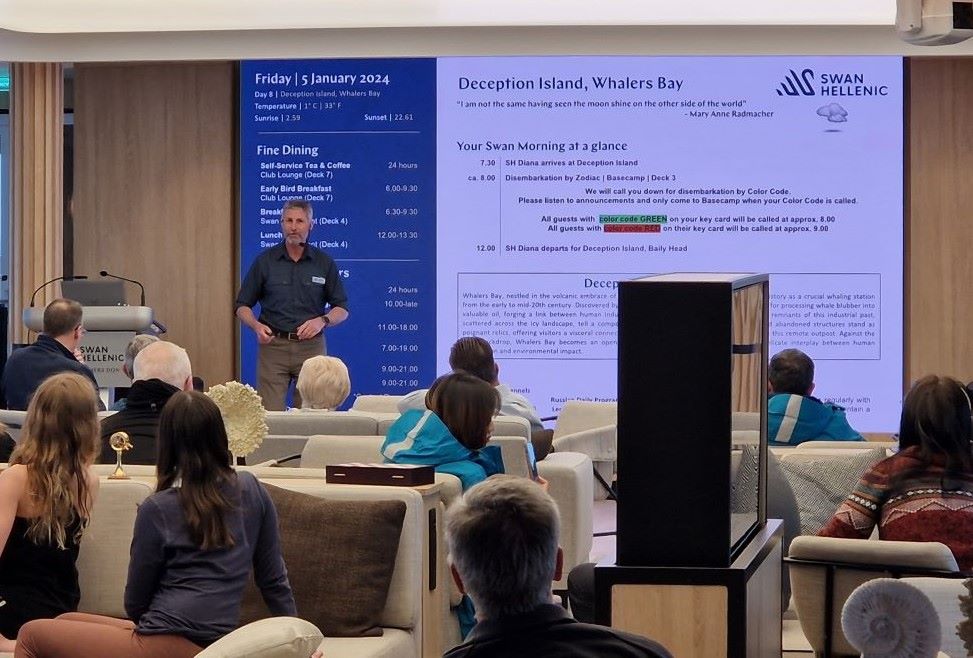 Port Lockroy: Besuch der Forscher und Stiftungsmitarbeiter auf der SH Diana mit Vortrag über das Leben und Arbeiten in Port Lockroy (Landgang wegen Pinguin-Übervölkerung nicht möglich gewesen). Südlichstes Postamt der Welt.