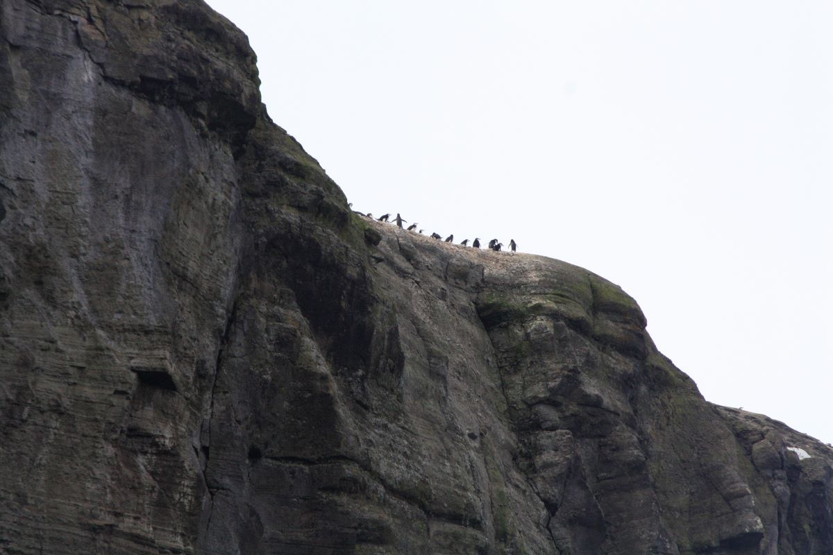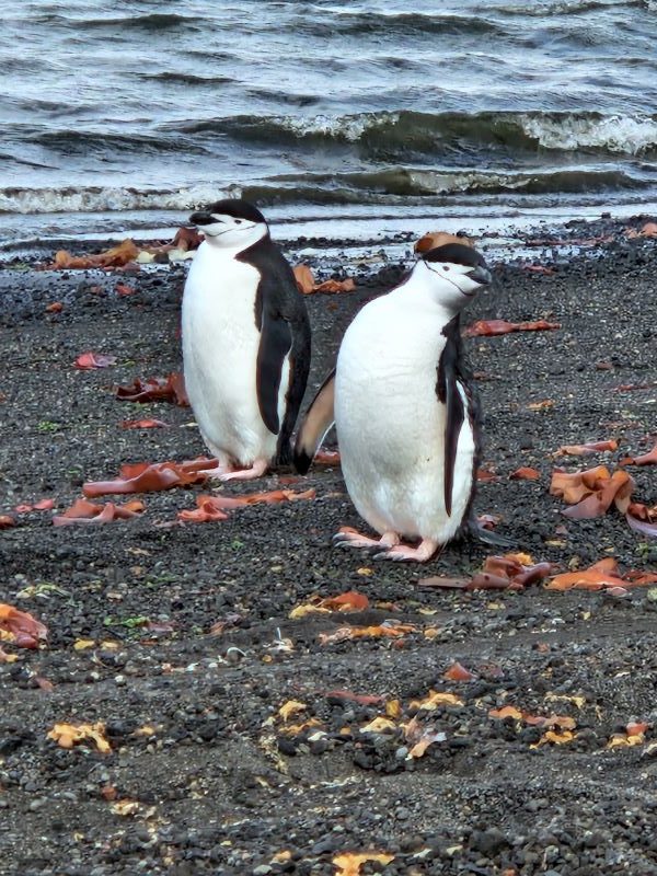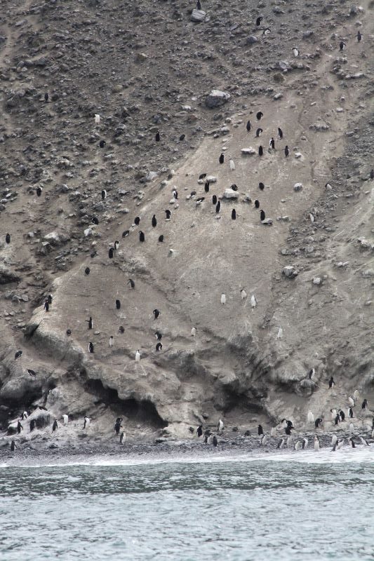 Nach einer relativ schaukeligen Nacht, fahren wir während des Frühstücks durch eine schmale Lücke eines Vulkankegels und das Wasser ist plötzlich: ruhig – der Kapitän hat uns in den runden Krater Deception Island gezirkelt. Es mutet sehr nach Jules Verne und seiner Nautilus an. Deception Island ist immer noch aktiv, daher sind die Berghänge auch nicht mit Schnee und Eis bedeckt. Im Flachwasser an der Uferlinie steigen kleine Bläschen durch den Sand. Die erkalteten Lavaströme von den Hängen über den breiten, fast schwarzen Vulkan-Strand zum Wasser vom letzten Ausbruch 1969 sind noch gut zu erkennen. Nach diesem Ausbruch haben sich die letzten verbliebenen Forschungsaktivitäten von hier zurückgezogen. Der Spaziergang an Land führt uns durch die Hinterlassenschaften einer ehemaligen Walverarbeitungsstation – interessant und erschreckend zugleich. Seit nunmehr über 70 Jahren rosten und verfallen die Überbleibsel der Fabrik- und Wirtschaftsgebäude der Walfettkocherei (oder eben auch nicht; bei diesem kalten Klima). Selbst ein ehemaliger Flugzeughangar etwas abseits ist noch gut „in Schuss“. Ein mahnendes Zeugnis dafür, was die kurzfristige Verfolgung wirtschaftlicher Interessen in einem so empfindlichen Ökosystem anrichten kann. Nur die Gefahrstoffe (Öle, Batterien, etc.) wurden in einer Reinigungsaktion in den achtziger Jahren weggeholt. Einige neugierige Pinguine sind auch in die Bucht gekommen. Vermutlich wollen sie sich die Füßchen auf dem warmen Sand aufwärmen – oder für Fotos posieren. Den Mindestabstand von 5 Metern können wir fast nicht einhalten; wir werden verfolgt!