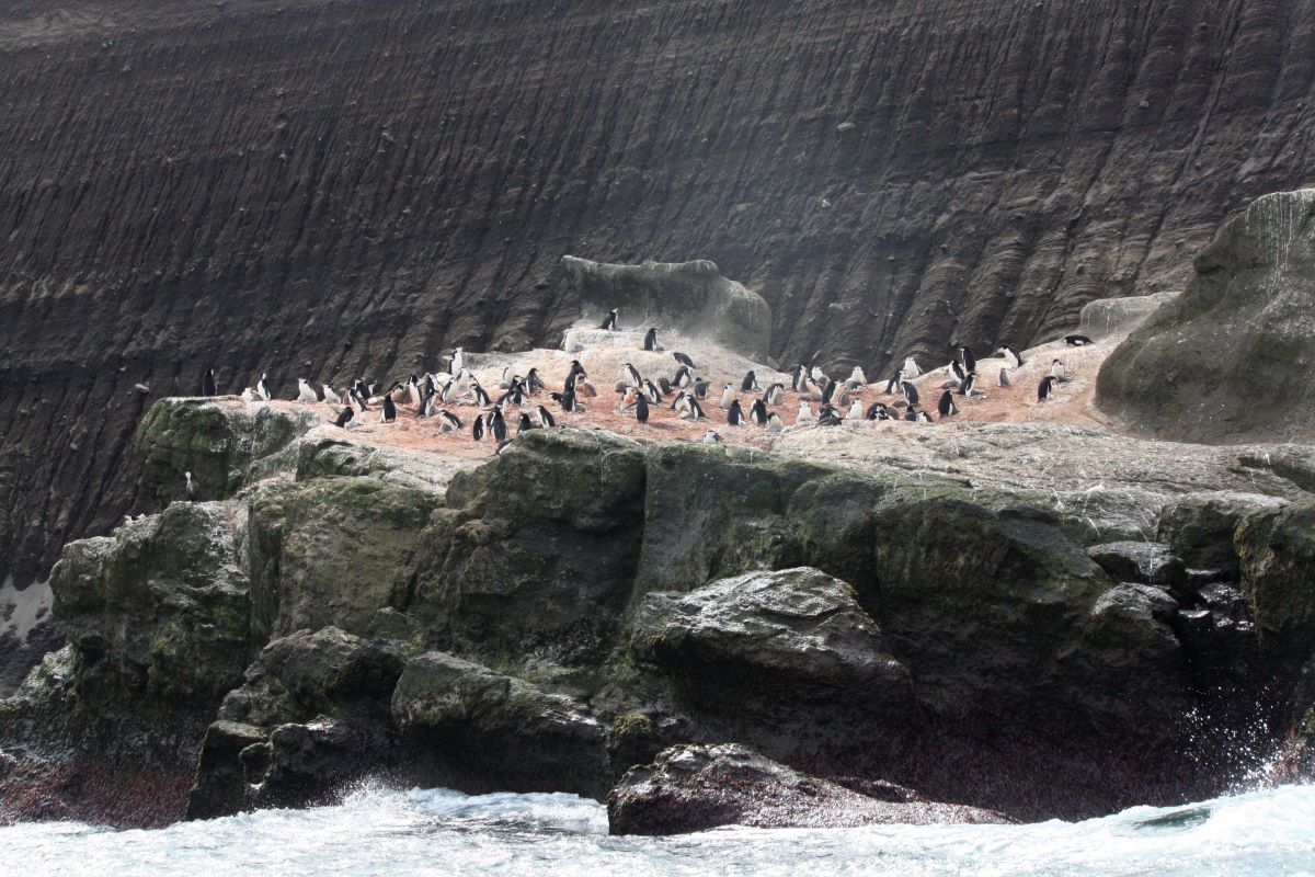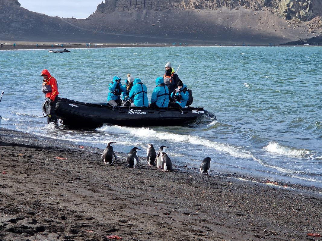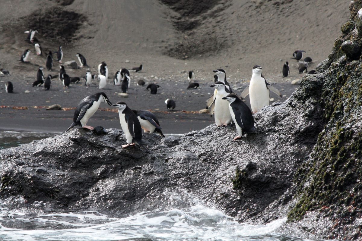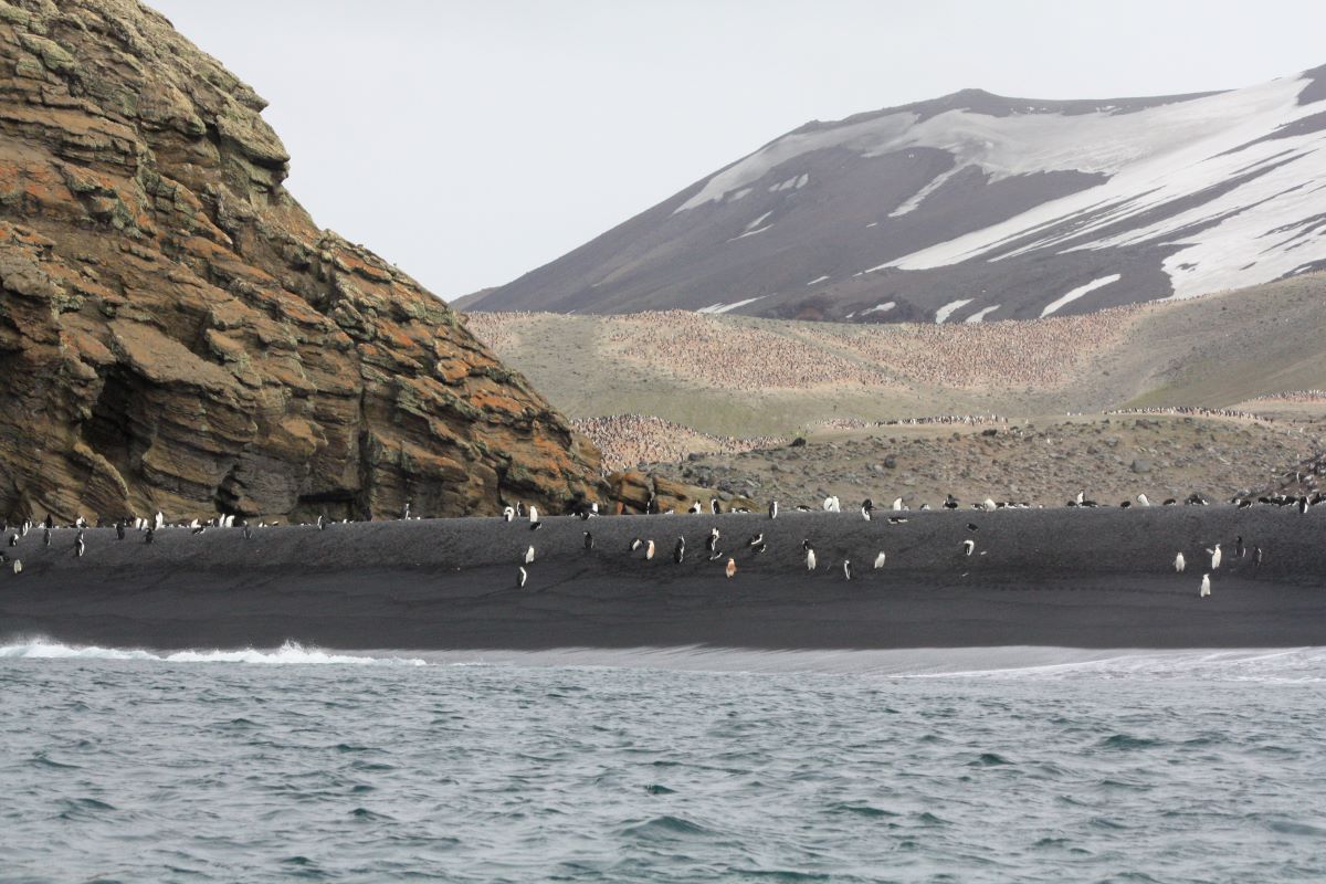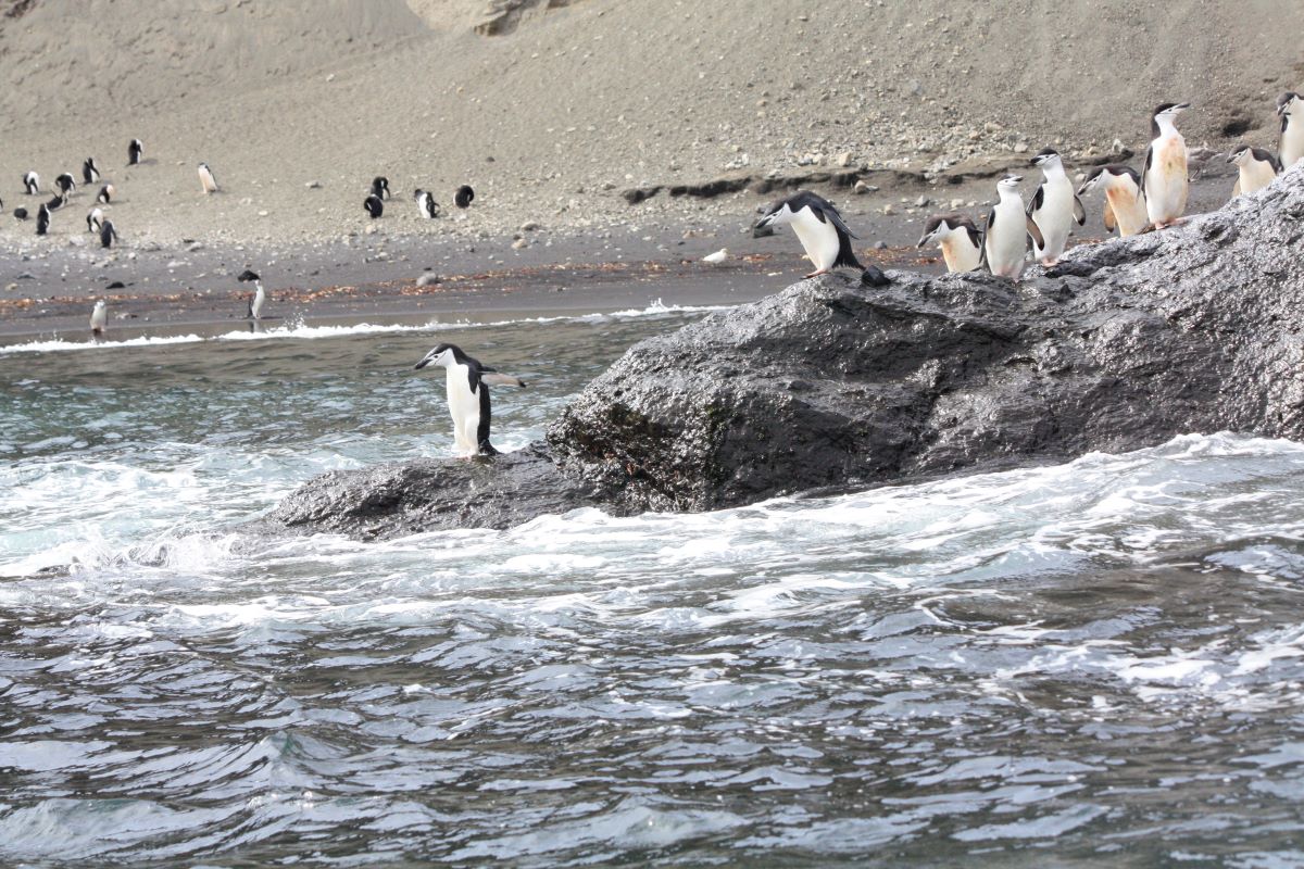 Baily Head (an der Außenseite des Vulkankegels Deception Island) mit seinen eindrucksvollen vulkanischen Gesteinsformationen bietet einen atemberaubenden Anblick auf die hier zu tausenden lebenden Chinstrap-Pinguine. Sie flitzen und springen zum Teil nur wenige Meter an unserem kleinen Zodiac vorbei.
