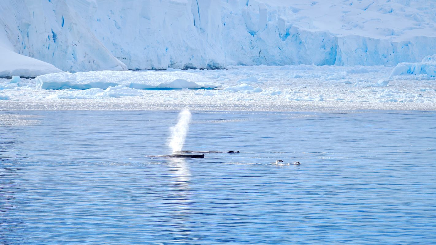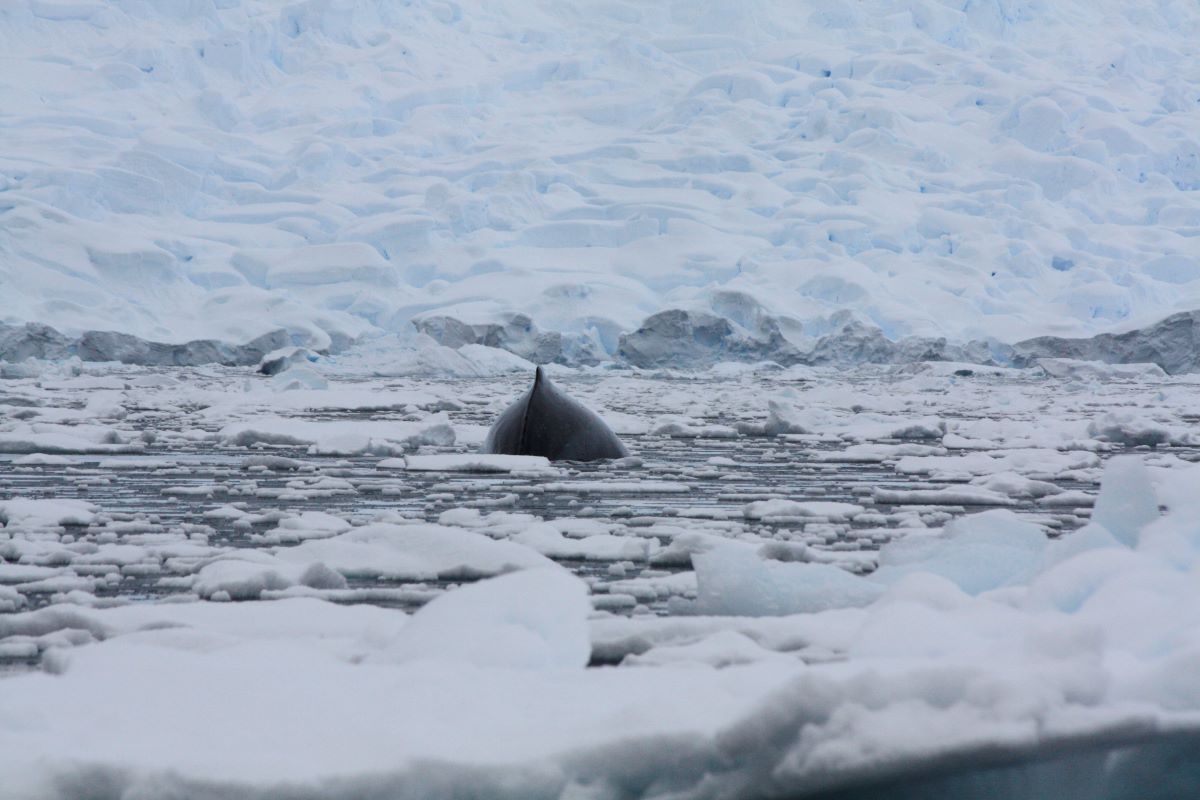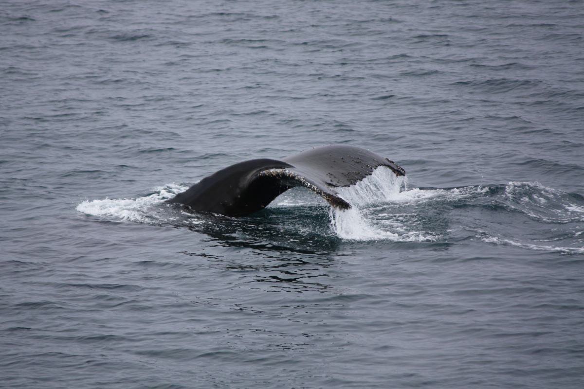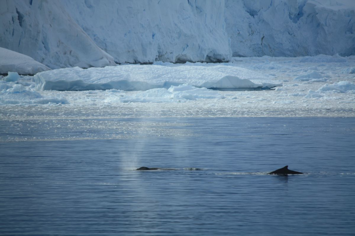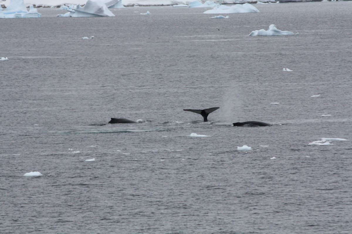 Die Feierlaune hält aber nicht lange an. Denn nur 10 Minuten später kommt die Durchsage von Expeditionsleiter Richard: „ladies and gentlemen: we have whales around the boat!“. Der Kapitän lässt das Boot stoppen, wir schnappen uns warme Jacken und Mützen, flitzen nach draußen und erleben ein grandioses Schauspiel. Mehrere Buckelwale tummeln sich um das Schiff und ziehen ihre Bahnen durch die mit Krill gesättigten Gewässer. Ein Silvestermenü auf „walisch“. Wir können unser Glück mal wieder kaum fassen.
