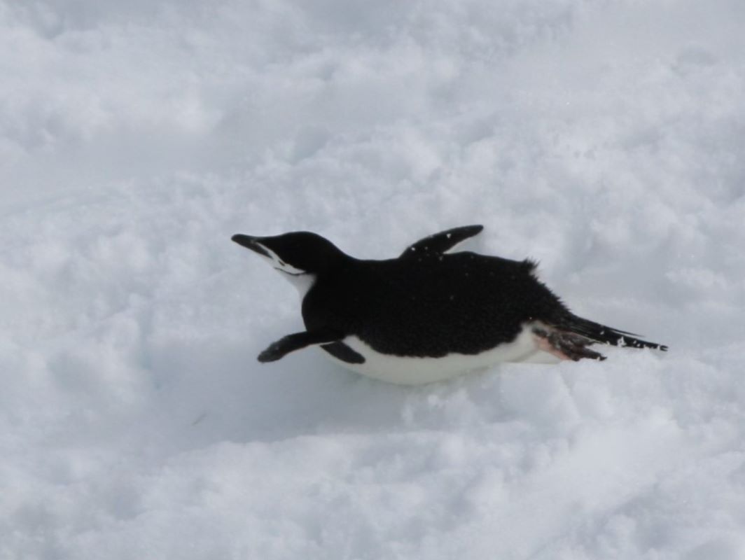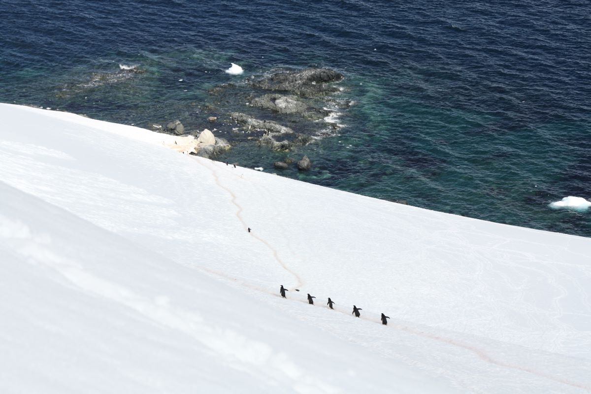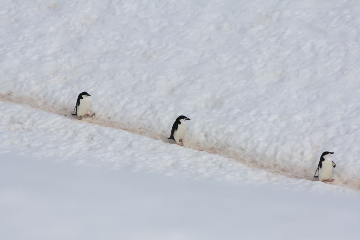 Die folgenden 5 Tage laufen in ihrem Rhythmus ähnlich ab. Morgens ein Landgang, nachmittags entweder ein neuerlicher Landgang oder ein Schlauchbootausflug durch die antarktischen Eisgewässer. Dazu verlegt die Diana jeweils tagsüber oder über Nacht den Standort, um ein möglichst abwechslungsreiches Angebot an Ausflugszielen zu erreichen. Jeder neue Ort bietet ein einmaliges Erlebnis. Mal sind es Pinguinkolonien, für deren Beobachtung wir schwindelerregende Höhen erklimmen müssen (wie schaffen die Tierchen auf ihren kleinen Füßchen das bloß?); dichte, rosagefärbte „Straßennetze“ durchziehen als Pinguin-Highways die schneebedeckten Hänge, dann wieder Seehund- oder Walgebiete. Auch ein Besuch der argentinischen Forschungsstation Brown-Station steht auf dem Programm. Die tiefblauen Skulpturen aus uraltem Gletschereis, die einfach um uns herum im Meer schwimmen sind bezaubernd schön und man wähnt sich auf einem anderen Planeten.