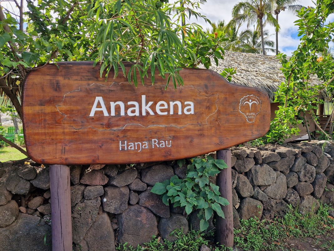Beim Aussteigen merken wir gleich, dass wir hier einen weiteren Gang zurückschalten können. Alles, aber wirklich alles läuft nochmal viel entspannter und ruhiger ab, als anderswo. Gut gelaunt laufen wir übers Vorfeld zum Ankunftsgarten(!). Keine Halle, sondern ein palmenbestandener, schattiger Garten. Ganz nach Südseetradition werden wir mit Blumenketten behängt bei schönstem Wetter willkommen geheißen. „Iroana“, herzlich willkommen auf Rapa Nui. Der Transfer ins Hotel Nayara Hangaroa dauert nur kurze vier Minuten; die Insel ist wirklich klitzeklein.