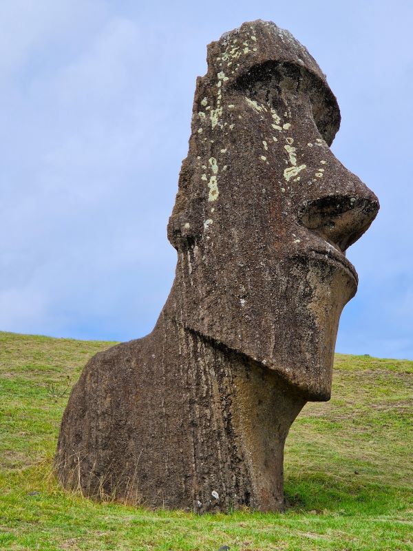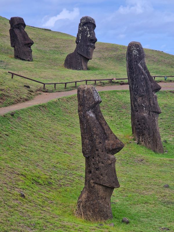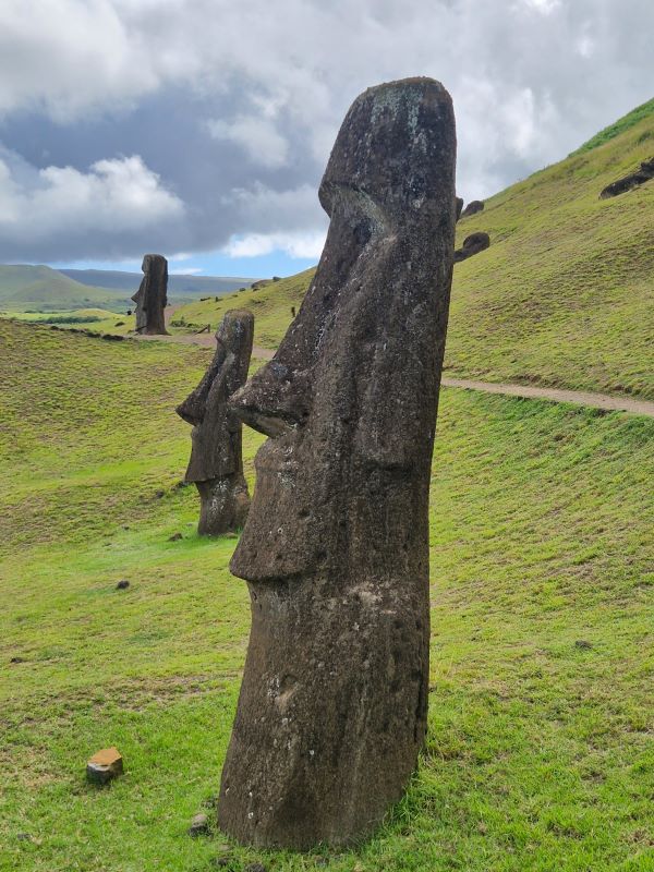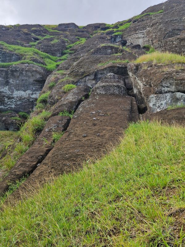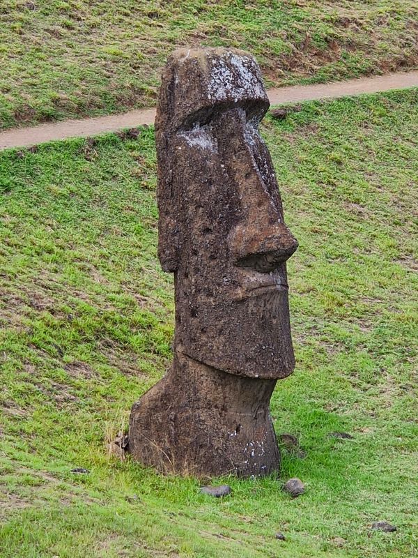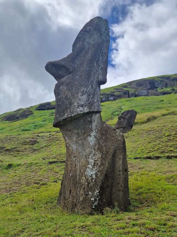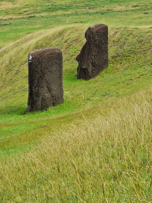 Die letzten Moais wurden kurz vor dem Zerfall der homogenen Inselgesellschaft im 17. und 18. Jahrhundert von spezialisierten Steinmetzen aus dem einzigen Steinbruch der Insel am Rano Raraku herausgemeißelt. Hier ruht auch noch der fast fertiggestellte, ambitionierteste Moai aller Zeiten: gut 20 Meter hoch und fast 250 Tonnen schwer. Wie diese Kolosse von der Moai-Werkstatt über mehrere Kilometer zu ihrem finalen Aufstellort transportiert wurden, ist heute trotz vieler Theorien (manche auch in der Praxis nachgestellt) noch nicht schlüssig geklärt. Aufgrund einer urplötzlichen Abkehr von der Moai-Religion bedecken heute noch 397 Steinkolosse in den unterschiedlichsten Fertigungsstadien den Hang…vom ersten Schnitzer im weichen Tuff bis hin zu fertigen Figuren, die zum Abtransport bereit am Fuße des Steinbruchs liegen. Wir fühlen uns wie bei einer Werks- bzw. Fabrikbesichtigung, wo die Maschinen von einem auf den anderen Tag einfach abgestellt wurden.