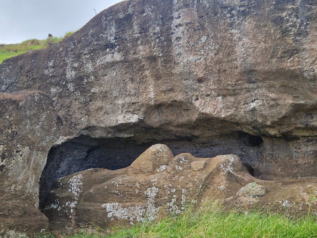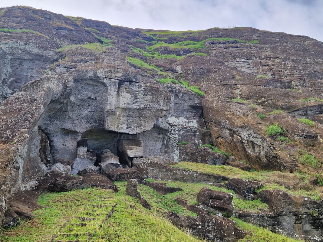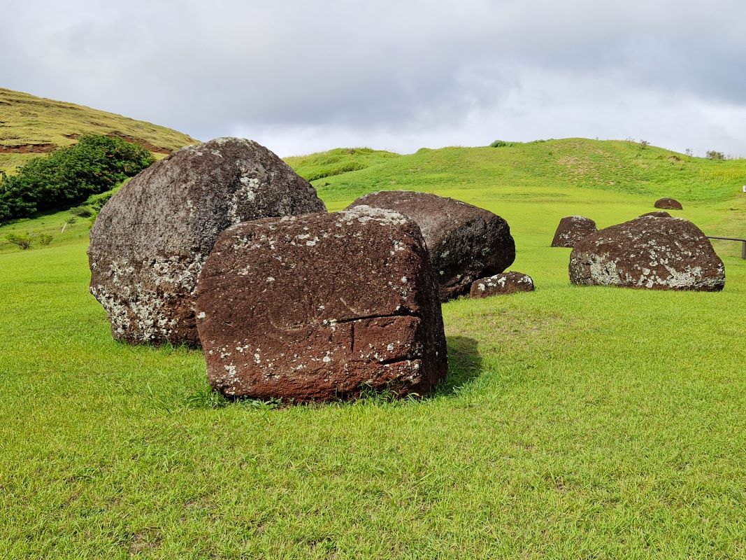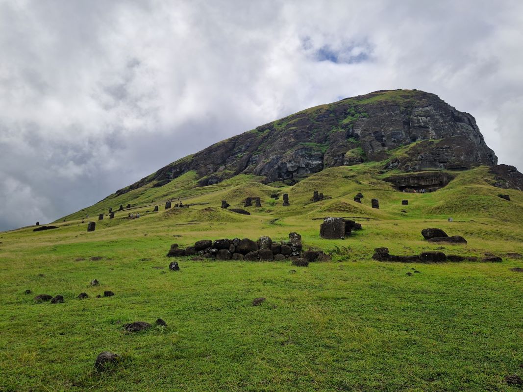 Die letzten Moais wurden kurz vor dem Zerfall der homogenen Inselgesellschaft im 17. und 18. Jahrhundert von spezialisierten Steinmetzen aus dem einzigen Steinbruch der Insel am Rano Raraku herausgemeißelt. Hier ruht auch noch der fast fertiggestellte, ambitionierteste Moai aller Zeiten: gut 20 Meter hoch und fast 250 Tonnen schwer. Wie diese Kolosse von der Moai-Werkstatt über mehrere Kilometer zu ihrem finalen Aufstellort transportiert wurden, ist heute trotz vieler Theorien (manche auch in der Praxis nachgestellt) noch nicht schlüssig geklärt. Aufgrund einer urplötzlichen Abkehr von der Moai-Religion bedecken heute noch 397 Steinkolosse in den unterschiedlichsten Fertigungsstadien den Hang…vom ersten Schnitzer im weichen Tuff bis hin zu fertigen Figuren, die zum Abtransport bereit am Fuße des Steinbruchs liegen. Wir fühlen uns wie bei einer Werks- bzw. Fabrikbesichtigung, wo die Maschinen von einem auf den anderen Tag einfach abgestellt wurden.