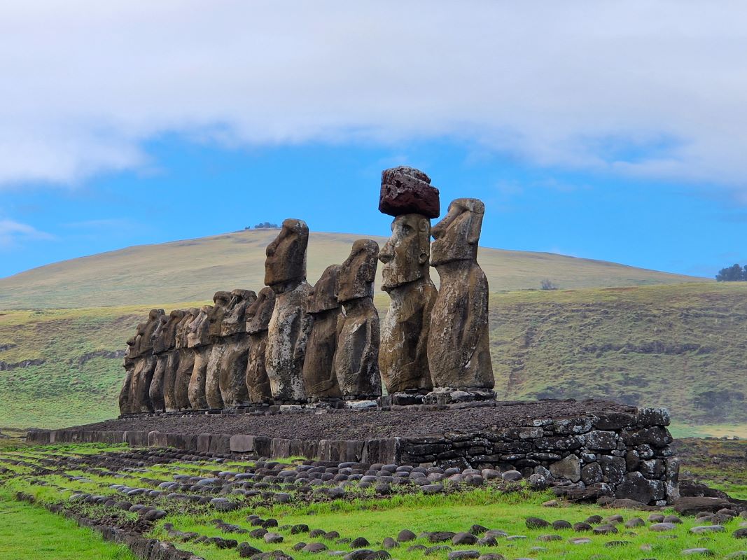 Die größte Ansammlung von Moais findet sich bei Ahu Tongariki. 15 Statuen, teilweise mit dem Haarknotenaufsatz, thronen tonnenschwer auf den flachen Fundamenten, wachen ehrwürdig über die Insel und flößen uns ganz schön Respekt ein. Die Kulisse ist ergreifend. Im Rücken der steinernen Riesen leuchtet der tiefblaue Pazifik und im Inselinneren erblickt man die Steilwand des Rano Raraku. Ein wahrhaft zauberhafter und energiegeladener Ort.