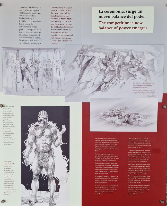 Von hier aus starteten auch die Wettkämpfe um das erste Ei der Brutsaison, der sogenannte Vogelmannkult. Die alte, in festgefahrenen Traditionen verhaftete Herrscherkaste hatte um die Mitte des 15. Jahrhunderts keine Antworten mehr auf die sozialen, spirituellen und vor allem auf die Nahrungsversorgungsprobleme, die mit der drohenden Überbevölkerung einhergingen. Folge: „Bürgerkrieg“ und Errichtung einer neuen Gesellschaftsorganisation. Nach dem Ende der monarchischen Regierungsform entstand ein System eines jährlich wechselnden Herrschers bzw. Herrscherclans.