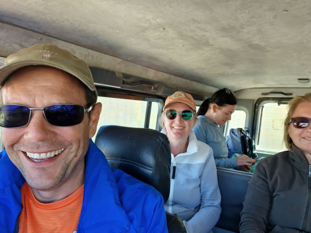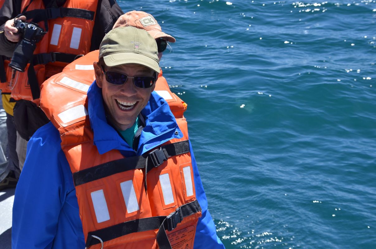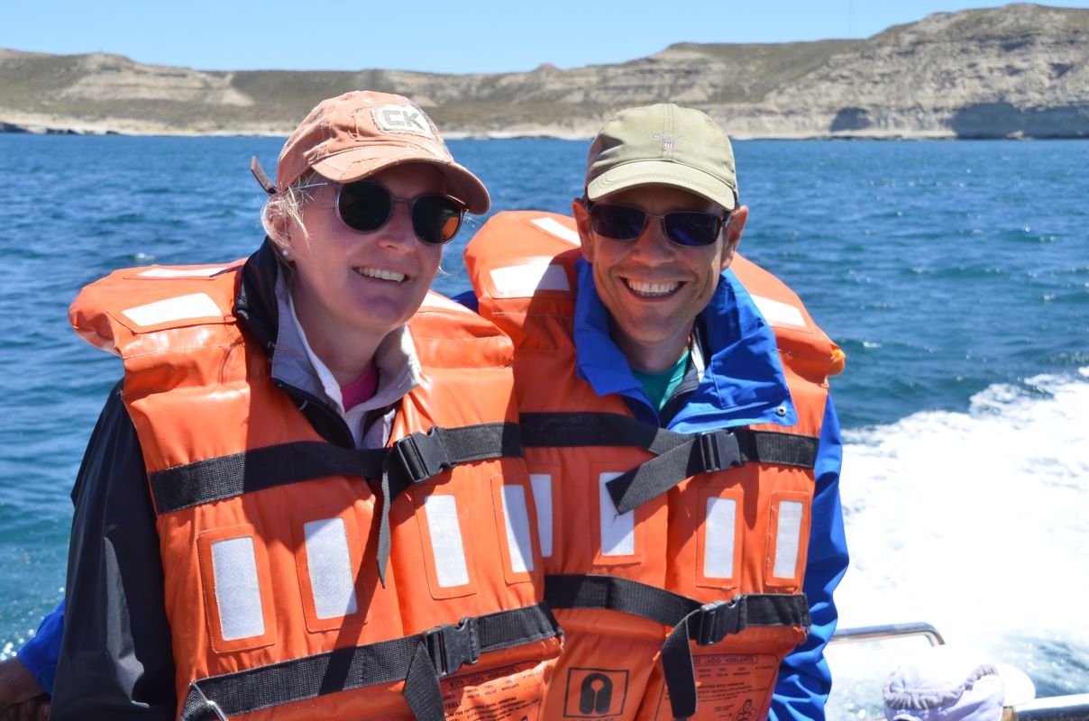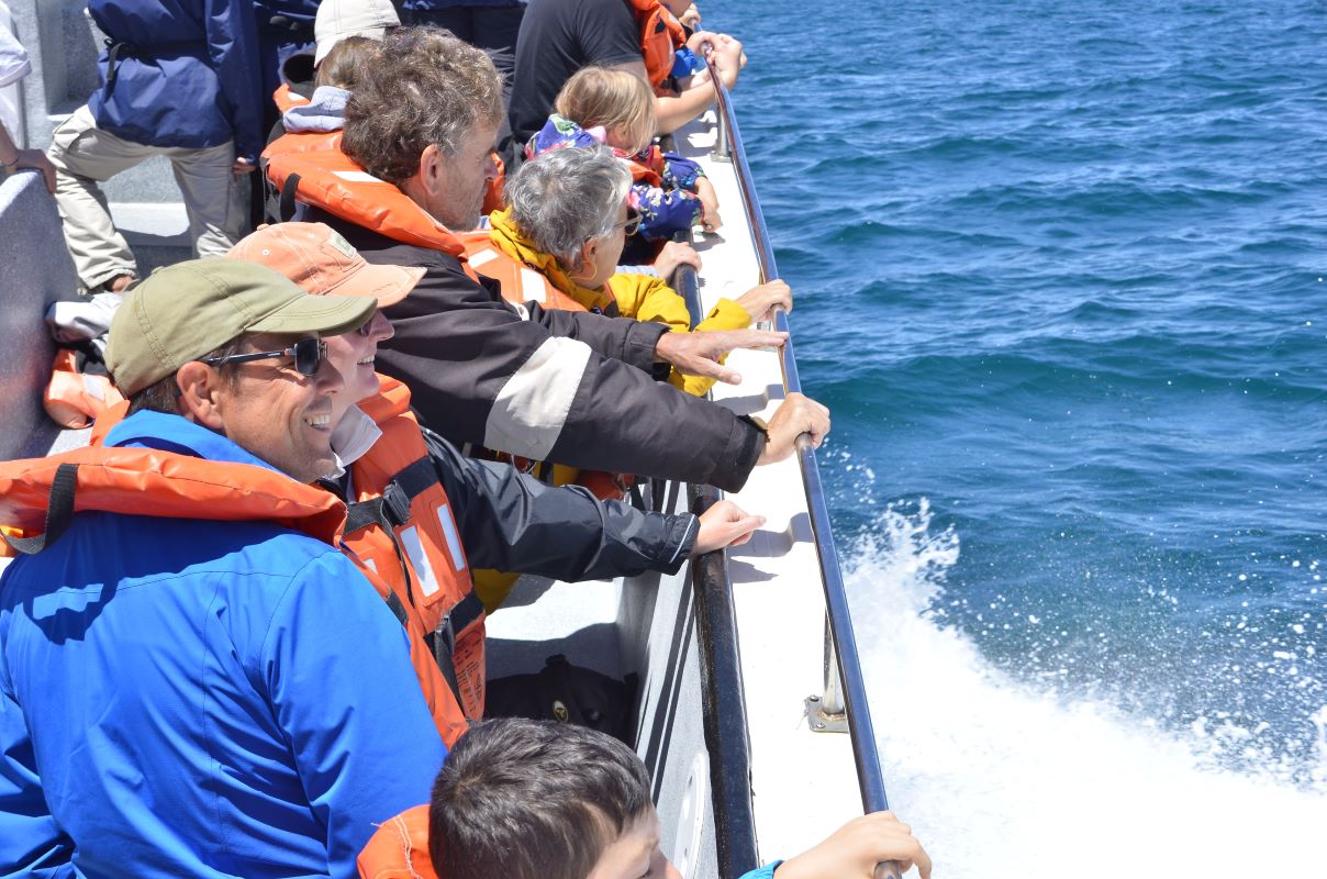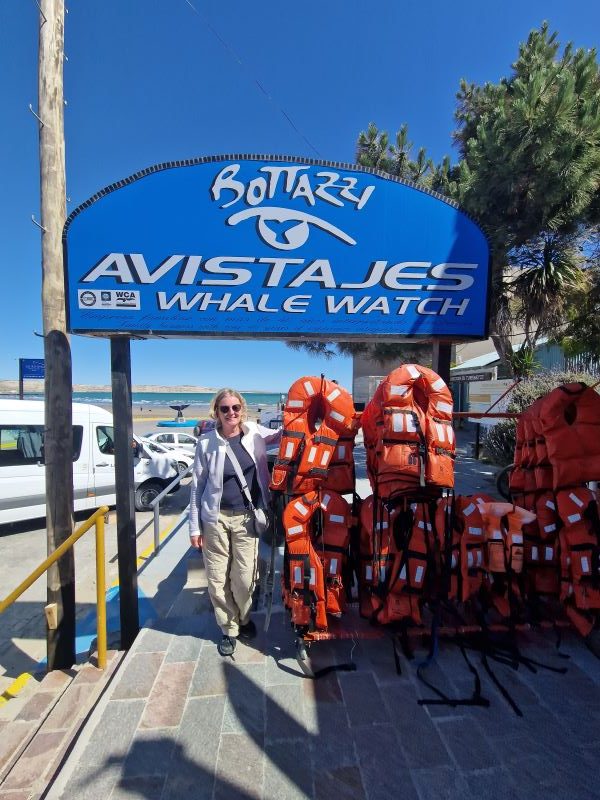 Vor Beginn der Tour zu den Walen werden wir ausgerüstet. Schwimmwesten und regen-/spritzwasserfeste Kleidung. Heute sind wir zusammen etwa 35 Personen auf dem Boot. Eine Gruppe Italiener ist auch dabei; eine 12-köpfige Großfamilie auf Südamerikareise – von der Großmutter bis zum Enkel. Wir werden diese Familie ein paar Tage später auf einem Rasthof mit großem Hallo wieder treffen.
