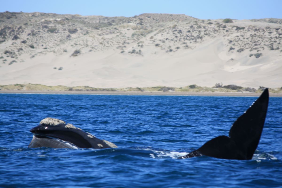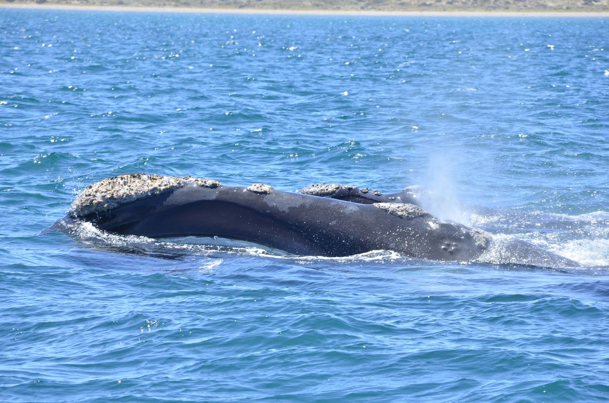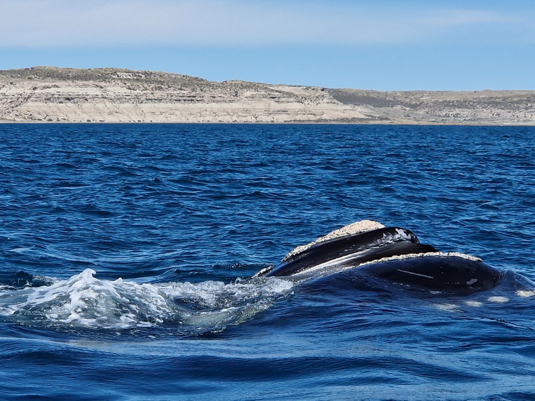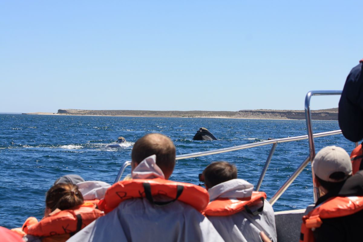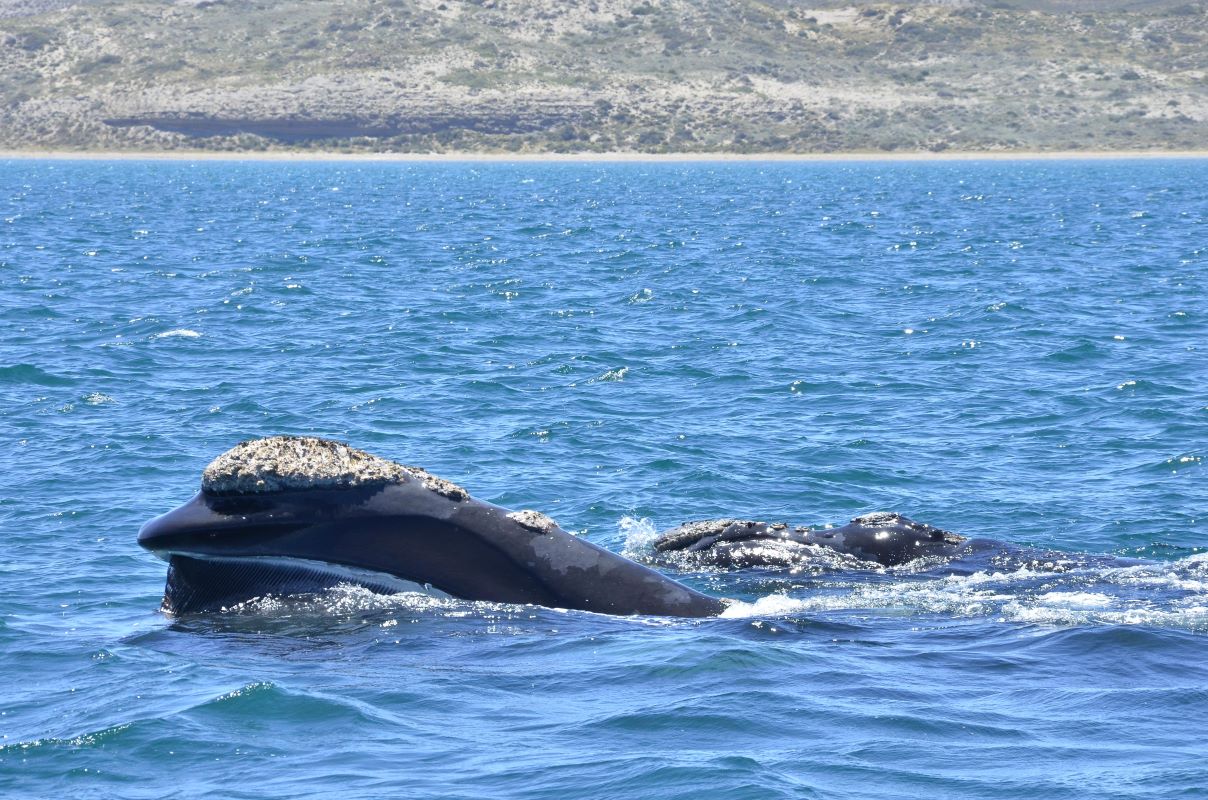 Über den flachen Strand wird unser Boot auf einem Anhänger rückwärts ins Meer geschoben und schon fliegen wir über die Wellen hinaus aus der Bucht von Puerto Pirámides. Es ist das Ende der hiesigen Walsaison zwischen September und Anfang Dezember. Die meisten Tiere sind wieder weitergezogen Richtung Süden in die antarktischen Futtergründe. Und so suchen alle gespannt den Horizont nach den typischen Ausblasfontänen der Wale ab. Nach etwas mehr als 30 Minuten Fahrt können wir unser Glück kaum fassen. Sage und schreibe 5 Glattwalkühe (Southern Right Whales) mit ihren jeweiligen Kälbern schwimmen zusammen gemächlich ihre Bahnen und filtern Krill (kleinste Krebstierchen) aus dem Wasser. Immer hin und her. Mit abgestelltem Motor und in völliger Stille bestaunen wir die mächtigen, erhabenen und friedlichen Tiere, die zuweilen ganz, ganz nah ans Boot herankommen. Einzig das Blasen und das Klatschen der großen Fluken ist zu hören. Ansonsten ziehen diese Riesen für uns völlig lautlos durch das Wasser. Wir lassen an dieser Stelle die Bilder für sich sprechen.