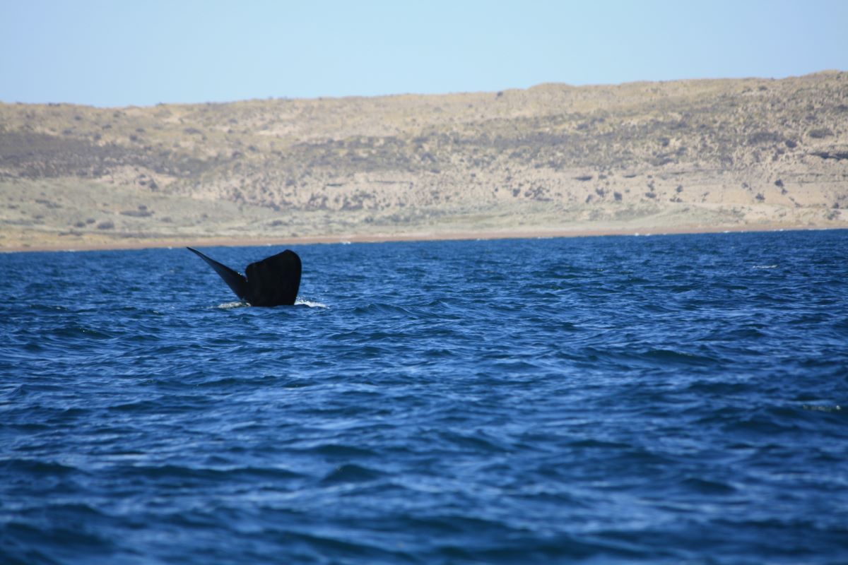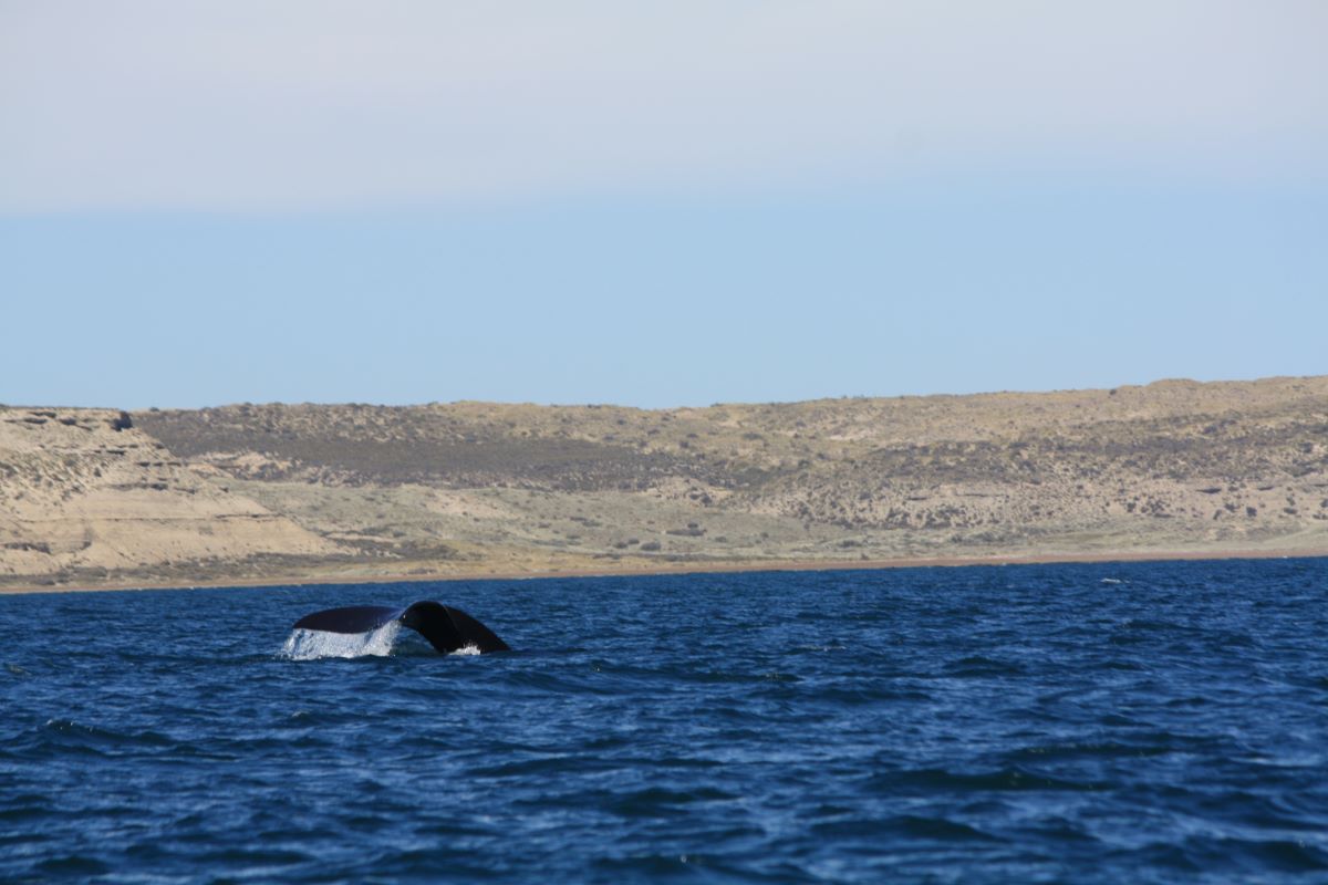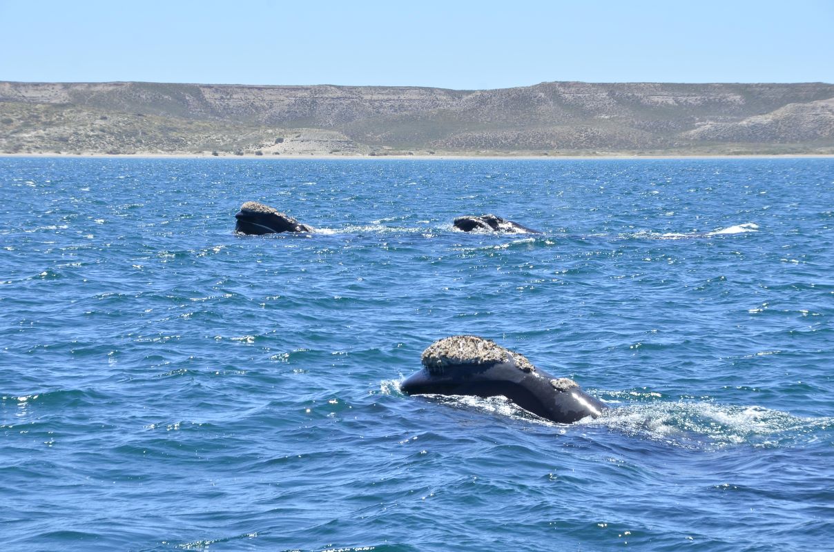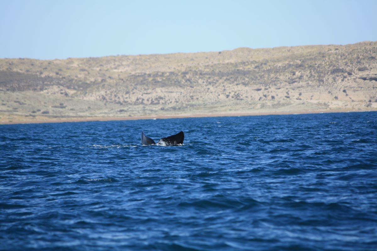 Über den flachen Strand wird unser Boot auf einem Anhänger rückwärts ins Meer geschoben und schon fliegen wir über die Wellen hinaus aus der Bucht von Puerto Pirámides. Es ist das Ende der hiesigen Walsaison zwischen September und Anfang Dezember. Die meisten Tiere sind wieder weitergezogen Richtung Süden in die antarktischen Futtergründe. Und so suchen alle gespannt den Horizont nach den typischen Ausblasfontänen der Wale ab. Nach etwas mehr als 30 Minuten Fahrt können wir unser Glück kaum fassen. Sage und schreibe 5 Glattwalkühe (Southern Right Whales) mit ihren jeweiligen Kälbern schwimmen zusammen gemächlich ihre Bahnen und filtern Krill (kleinste Krebstierchen) aus dem Wasser. Immer hin und her. Mit abgestelltem Motor und in völliger Stille bestaunen wir die mächtigen, erhabenen und friedlichen Tiere, die zuweilen ganz, ganz nah ans Boot herankommen. Einzig das Blasen und das Klatschen der großen Fluken ist zu hören. Ansonsten ziehen diese Riesen für uns völlig lautlos durch das Wasser. Wir lassen an dieser Stelle die Bilder für sich sprechen.