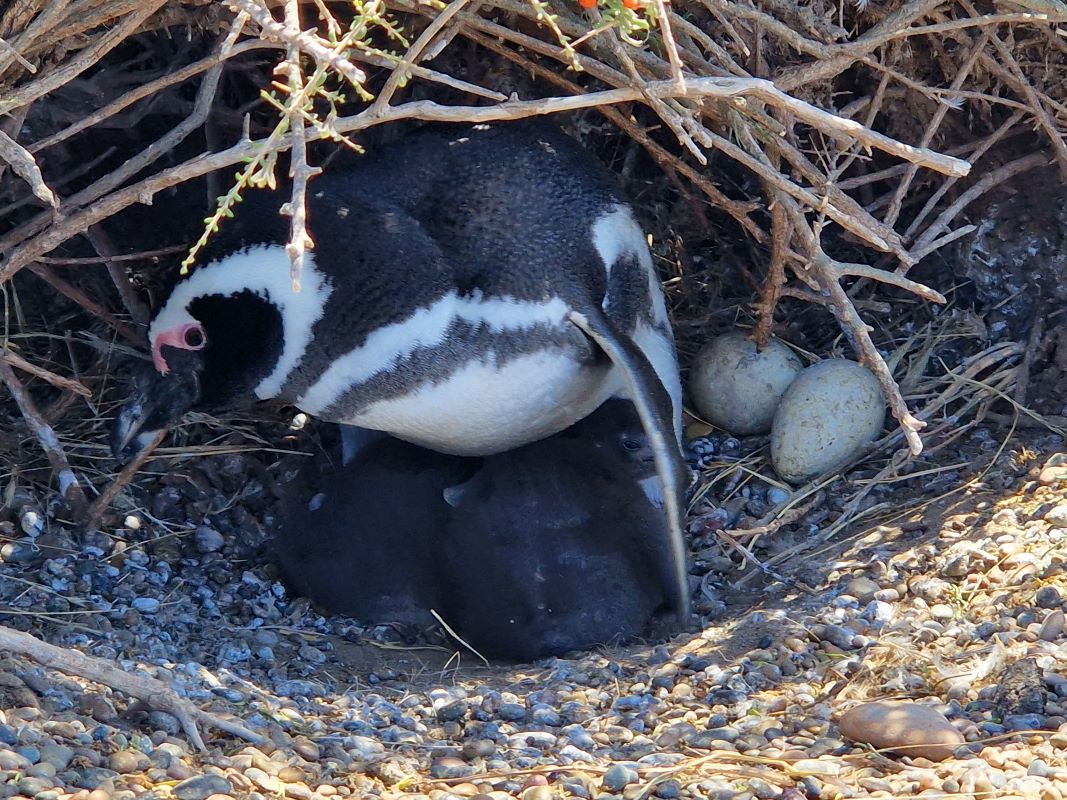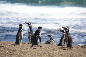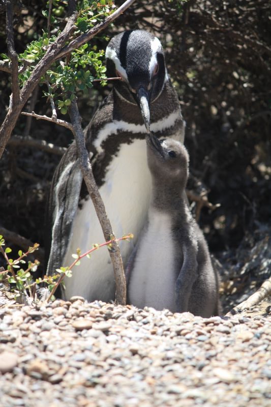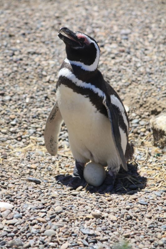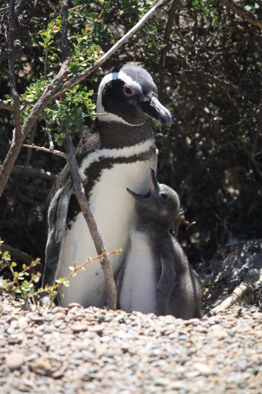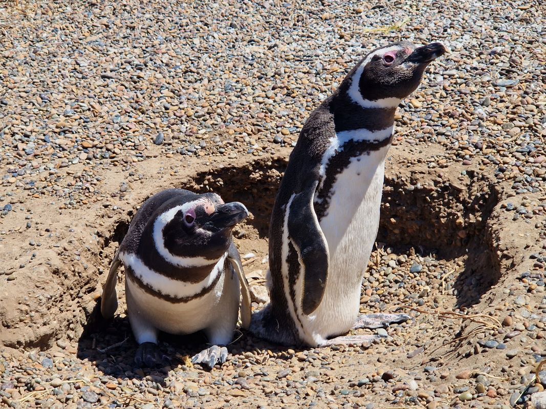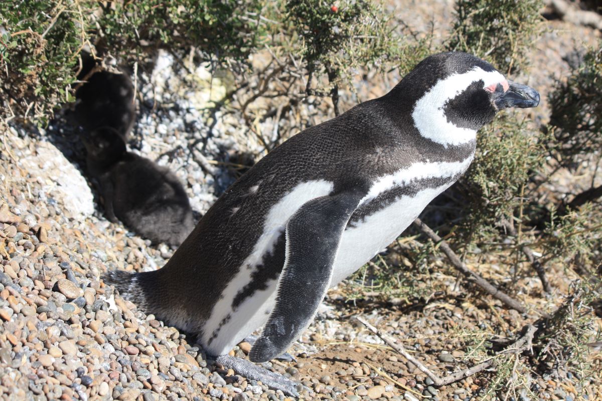 Magellanpinguine leben in großen Kolonien auf felsigen Küsten und Inseln im Süden Südamerikas. Ihren Namen erhielten sie aufgrund ihres Lebensraumes im Gebiet von Patagonien – „Terra Magellanica“. Die kleinen Kerlchen werden ca. 60 cm groß (etwa Kniehoch) und wiegen vier Kilogramm. Die Paare graben sich Höhlen zum Brüten in den steinigen Boden und kommen jedes Jahr wieder mit dem gleichen Partner zurück zur gleichen Höhle. Mitte Oktober werden pro Elternpaar zwei Eier gelegt und nach etwa 40 Tagen Brüten schlüpfen die Jungvögel.