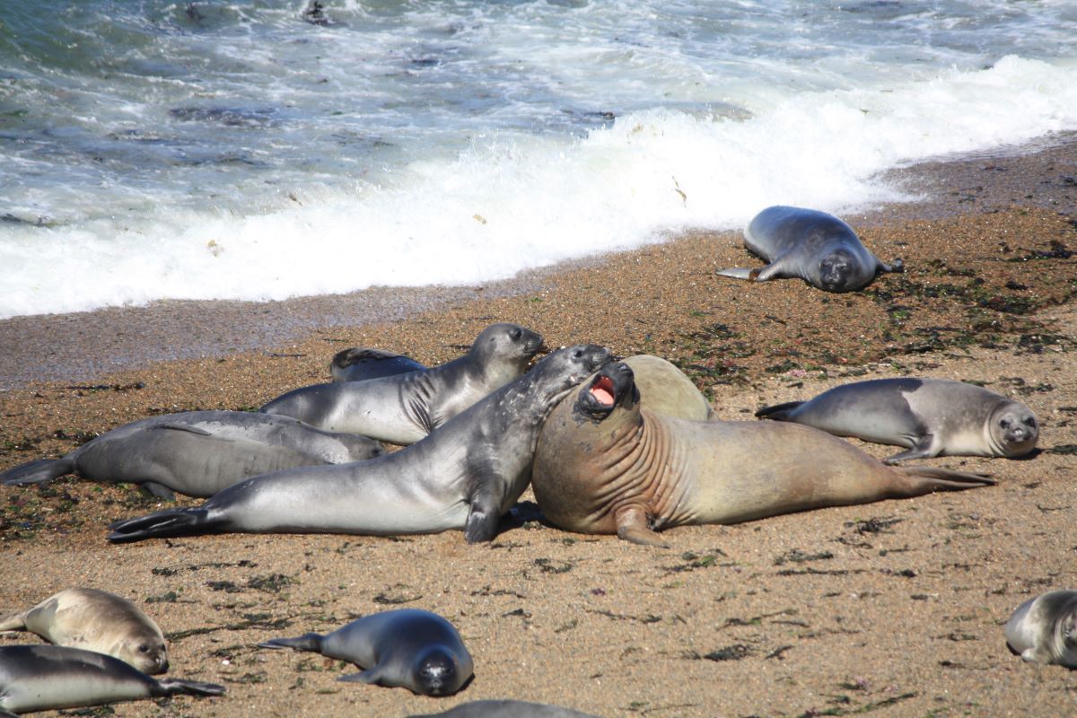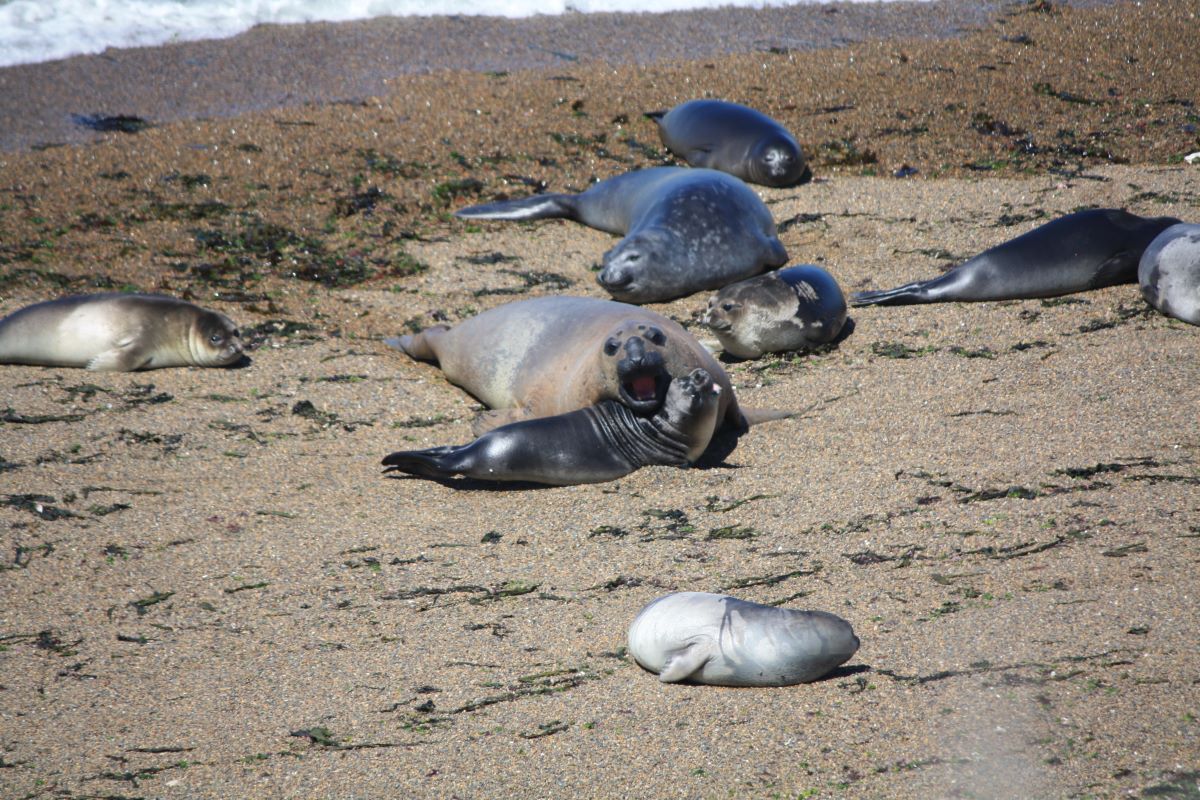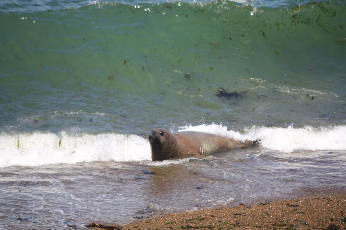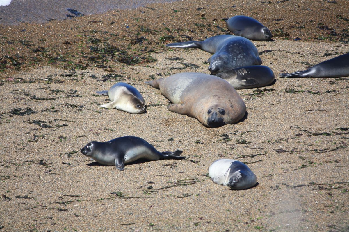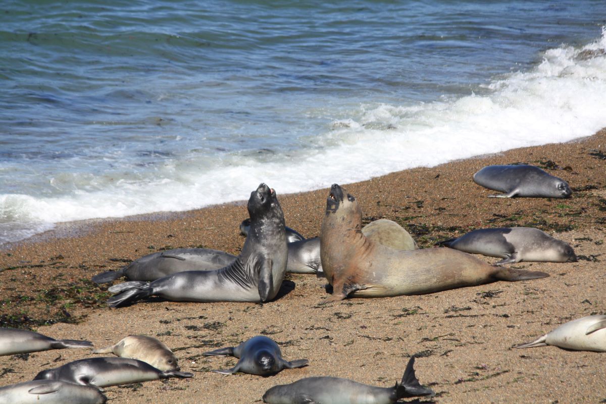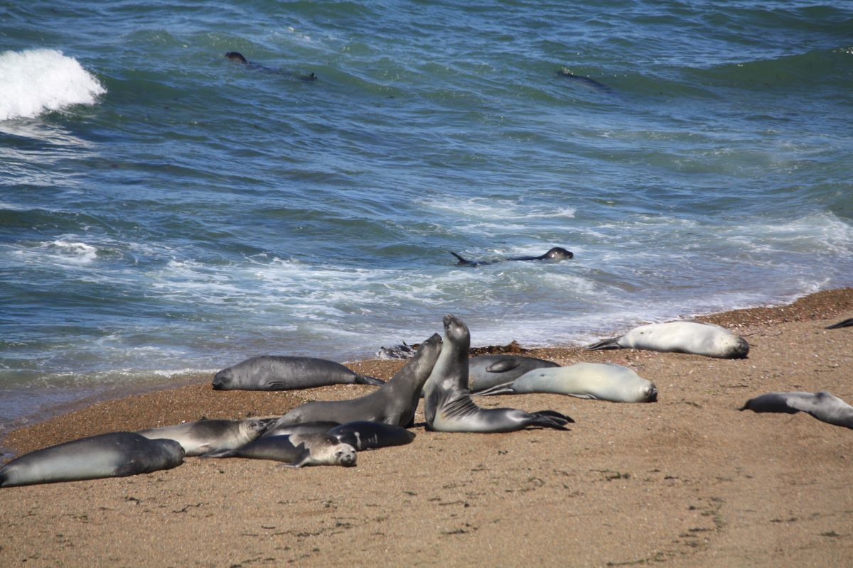 Hier am Punta Norte leben Seeelefanten. Ganz schön dicke Kolosse! Wir haben zwar nur Weibchen und ihre „Kleinen“ gesehen – die bringen aber auch einige Tonnen Gewicht auf die Waage. Einmal aus dem Wasser gerobbt – was immens anstrengend erscheint – bleiben diese gewaltigen Tieren dann normalerweise einfach in der Sonne liegen. Außer jedoch einer juckt das Fell und sie muss einen Streit mit der Nachbarin vom Zaun brechen. Dann geht es plötzlich ungestüm und laut zur Sache. Die Babys versuchen der Arena schnell zu entfliehen, wissen sie doch um die Gefahr eines unvorsichtigen Einschlages von fast einer Tonne Lebendgewicht. Ein paar kleinere Seelöwen haben sich auch am Strand getummelt.