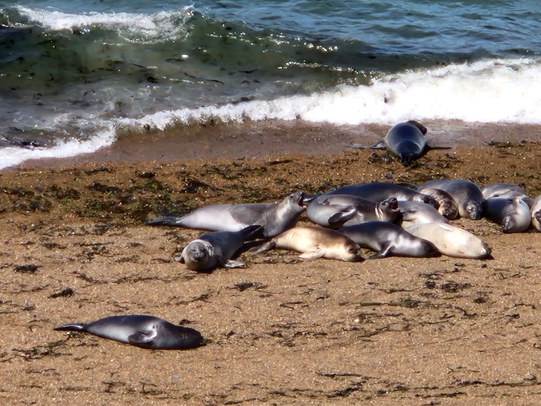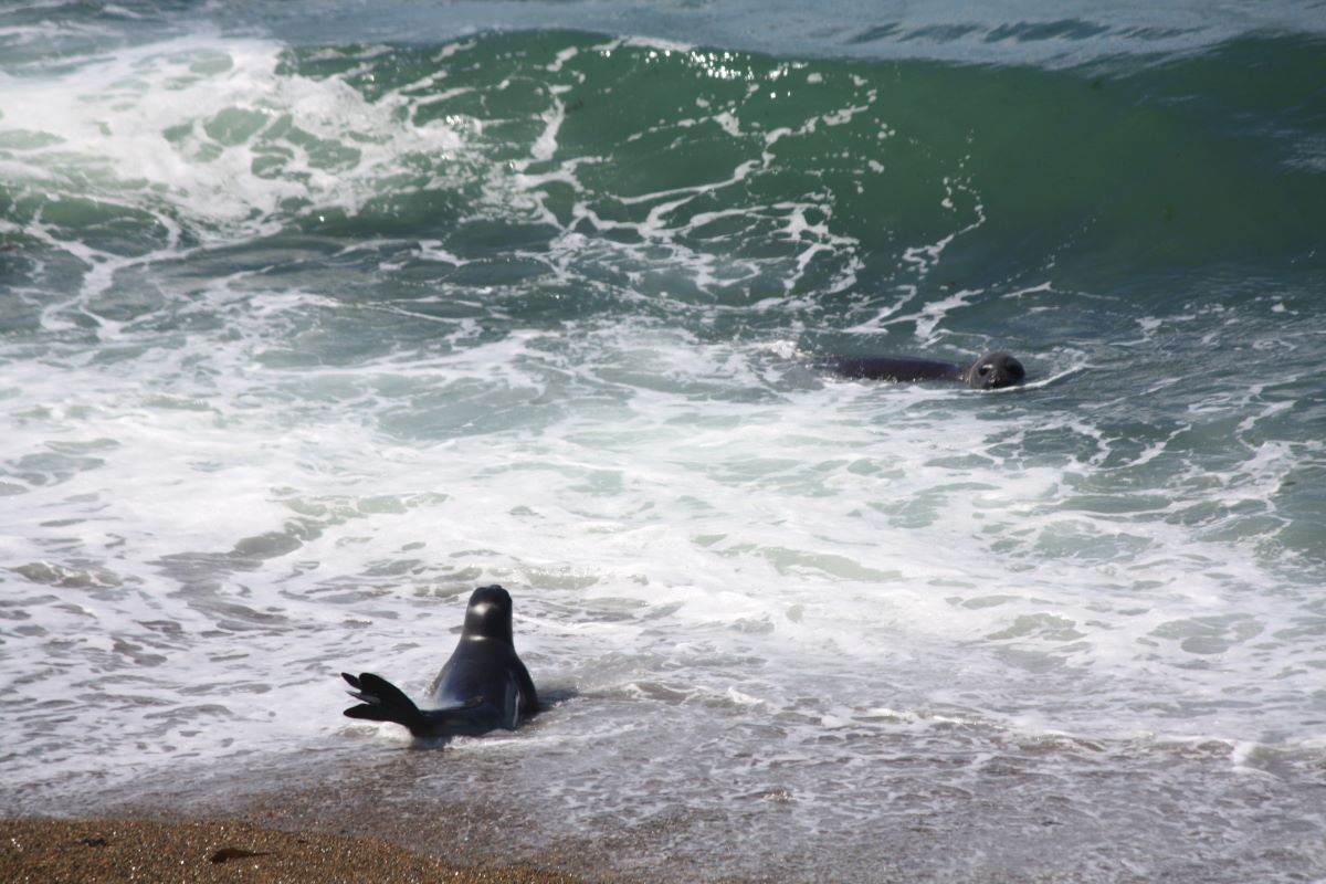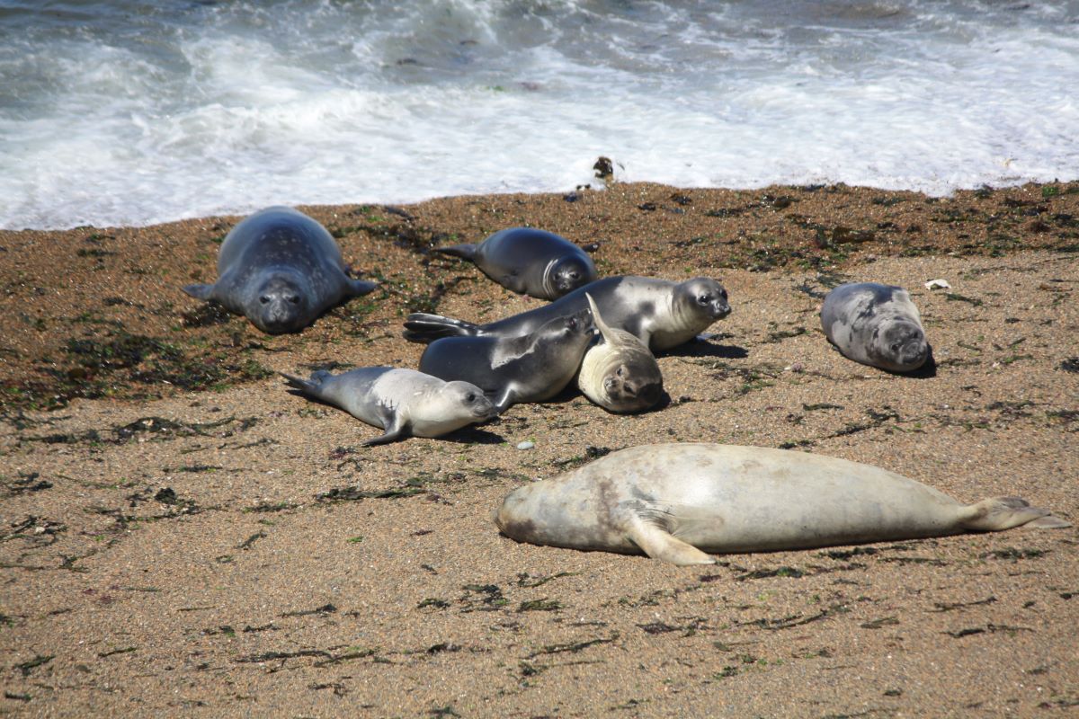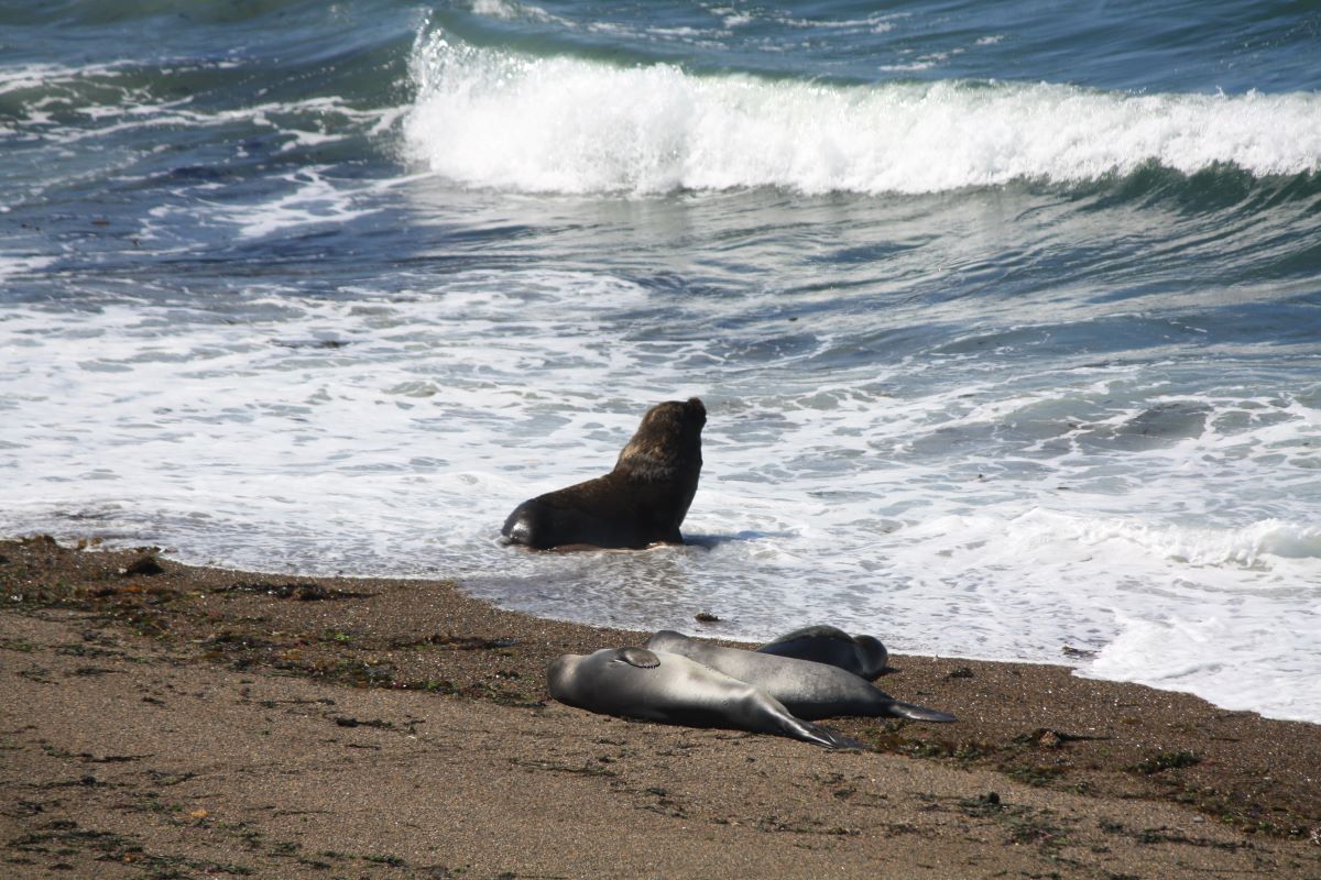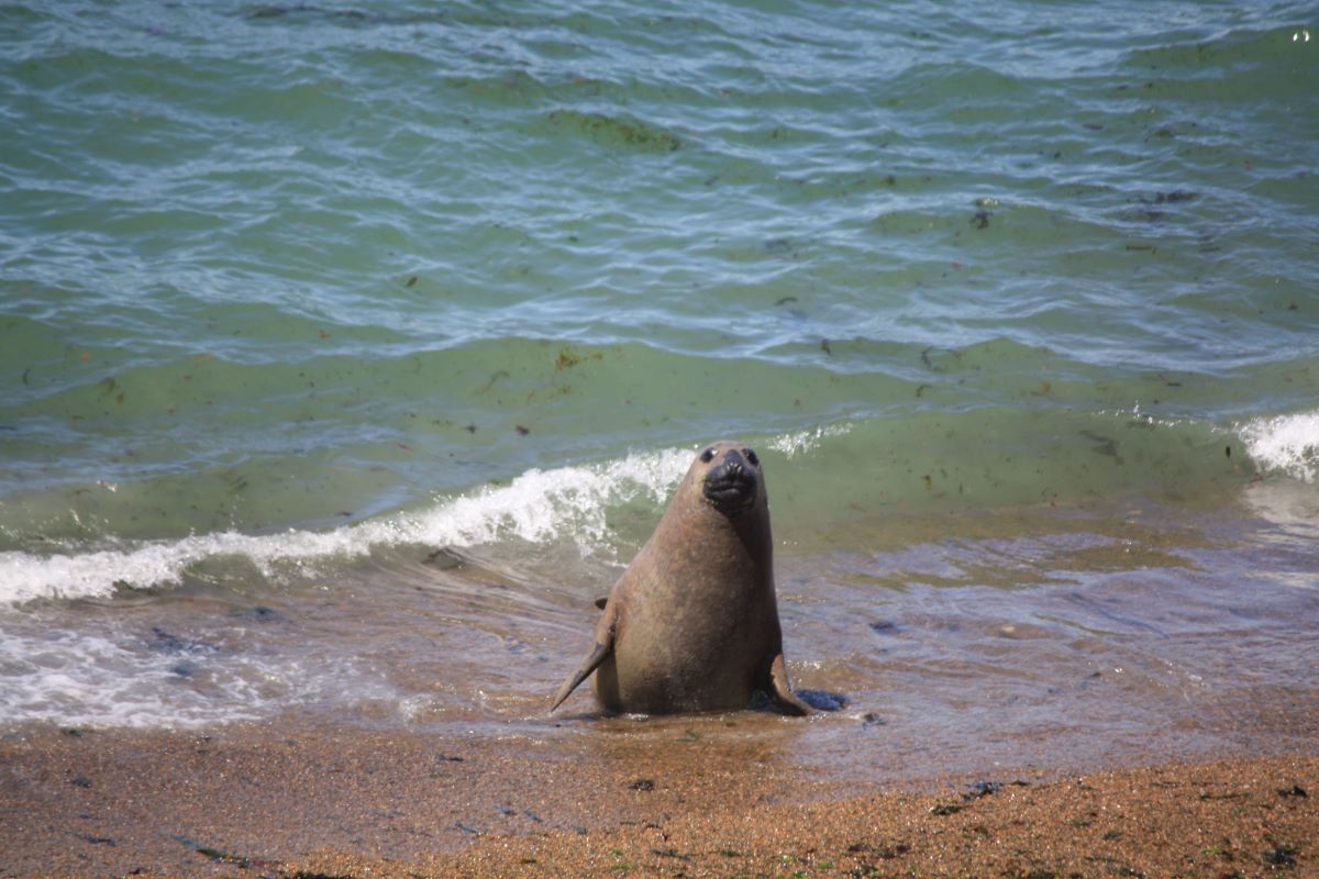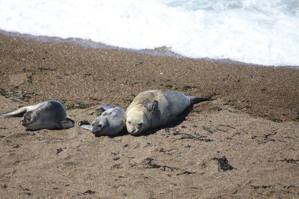 Hier am Punta Norte leben Seeelefanten. Ganz schön dicke Kolosse! Wir haben zwar nur Weibchen und ihre „Kleinen“ gesehen – die bringen aber auch einige Tonnen Gewicht auf die Waage. Einmal aus dem Wasser gerobbt – was immens anstrengend erscheint – bleiben diese gewaltigen Tieren dann normalerweise einfach in der Sonne liegen. Außer jedoch einer juckt das Fell und sie muss einen Streit mit der Nachbarin vom Zaun brechen. Dann geht es plötzlich ungestüm und laut zur Sache. Die Babys versuchen der Arena schnell zu entfliehen, wissen sie doch um die Gefahr eines unvorsichtigen Einschlages von fast einer Tonne Lebendgewicht. Ein paar kleinere Seelöwen haben sich auch am Strand getummelt.
