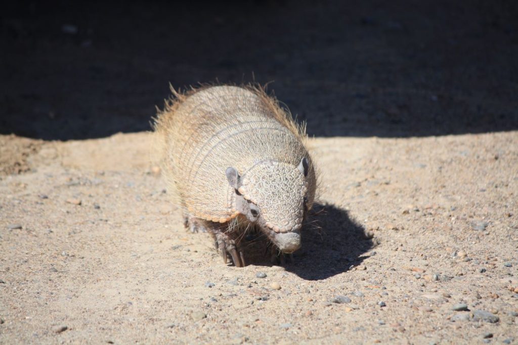 Kurz vor der Abfahrt zurück nach Puerto Pirámides krabbelt ein Amardillo (Gürteltier) unter unserem Wagen hervor.