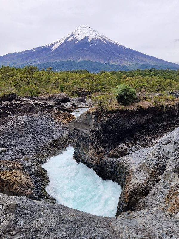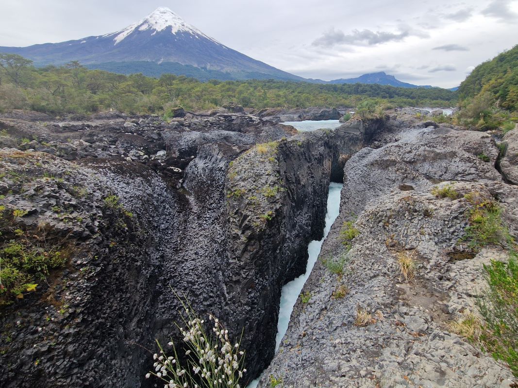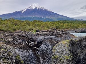 Zwischen den Lagos Llanquihue und Todos los Santos (Allerheiligen) am Fuß des Vulkans befinden sich tiefgrüne Wasserfälle und Stromschnellen, die Saltos de Petrohué im gleichnamigen Fluss. Ursprünglich waren diese beiden mal ein zusammenhängender See. Lavamassen des Osorno ergossen sich vor vielen Jahrtausenden in den See und teilten ihn entzwei; nunmehr verbunden durch den tief in die Lavaschichten gegrabenen Río Petrohué .
