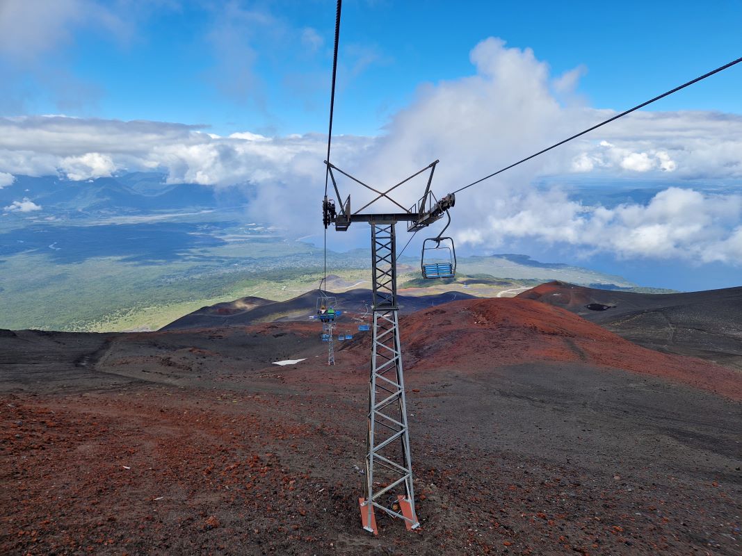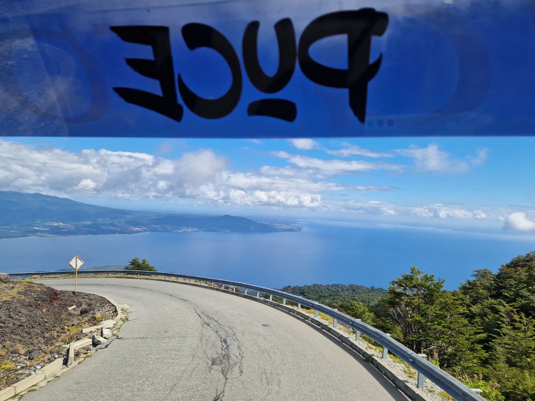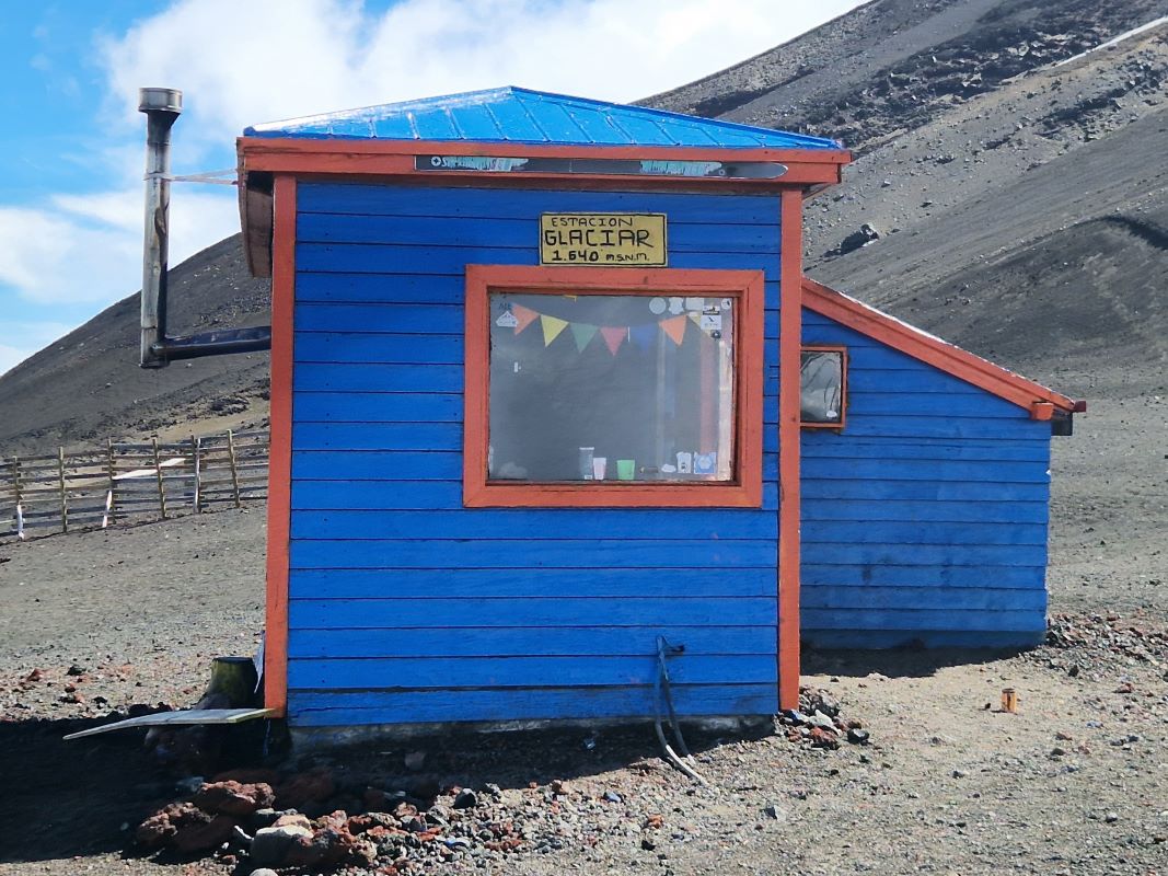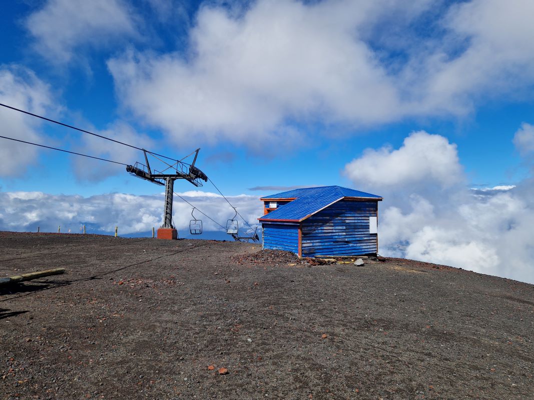 Nachdem wir die letzten Tage den Vulkan Osorno quasi umrundet haben, fahren wir am Vormittag bei Schleierwolken und wieder blauem Himmel die sehr, sehr steile Straße hoch zur Sesselliftstation. 12 Kilometer nur bergauf. Auf halber Strecke, am ersten Mirador, lassen wir PuCe verschnaufen und gönnen uns einen Kaffee umschwirrt von Kolibris, die durch die großen, rotblühenden Fuchsienbüsche um uns herum flitzen. Da Iris und Pavel die gleiche Idee hatten (wir treffen sie bei unserem Kolibri-Stopp), beschließen wir, gemeinsam mit dem Sessellift zum Gletscher hochzufahren.