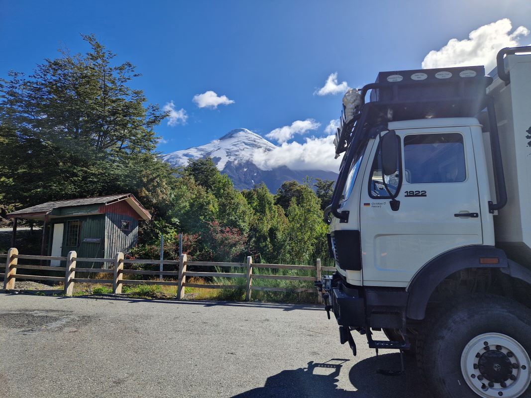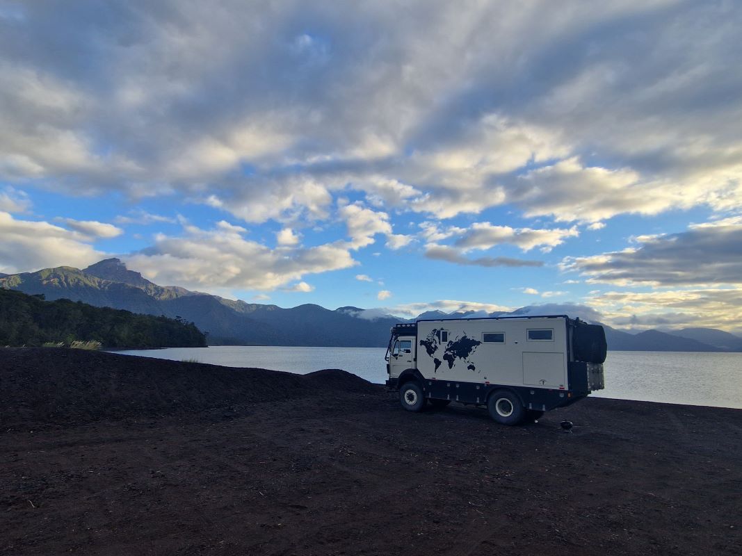 Am Ende des Tales, also am Lago Todos los Santos, gönnen wir uns den besten Stellplatz im kleinen Weiler Petrohué: direkt am Vulkansand-Strand mit atemberaubenden Blick auf den Vulkan Osorno und über den See auf die Andenkette. Und natürlich wagen wir den Sprung in das erfrischende Nass, um anschließend unter der wärmenden Dusche wieder auf Betriebstemperatur zu kommen.