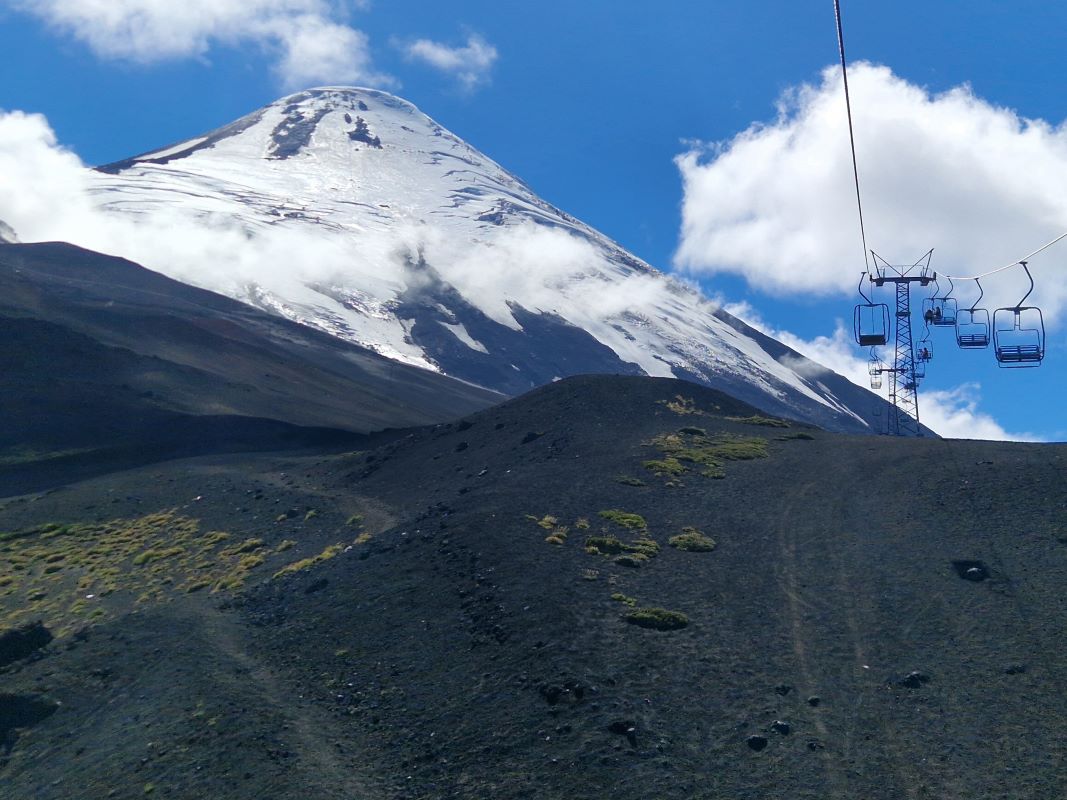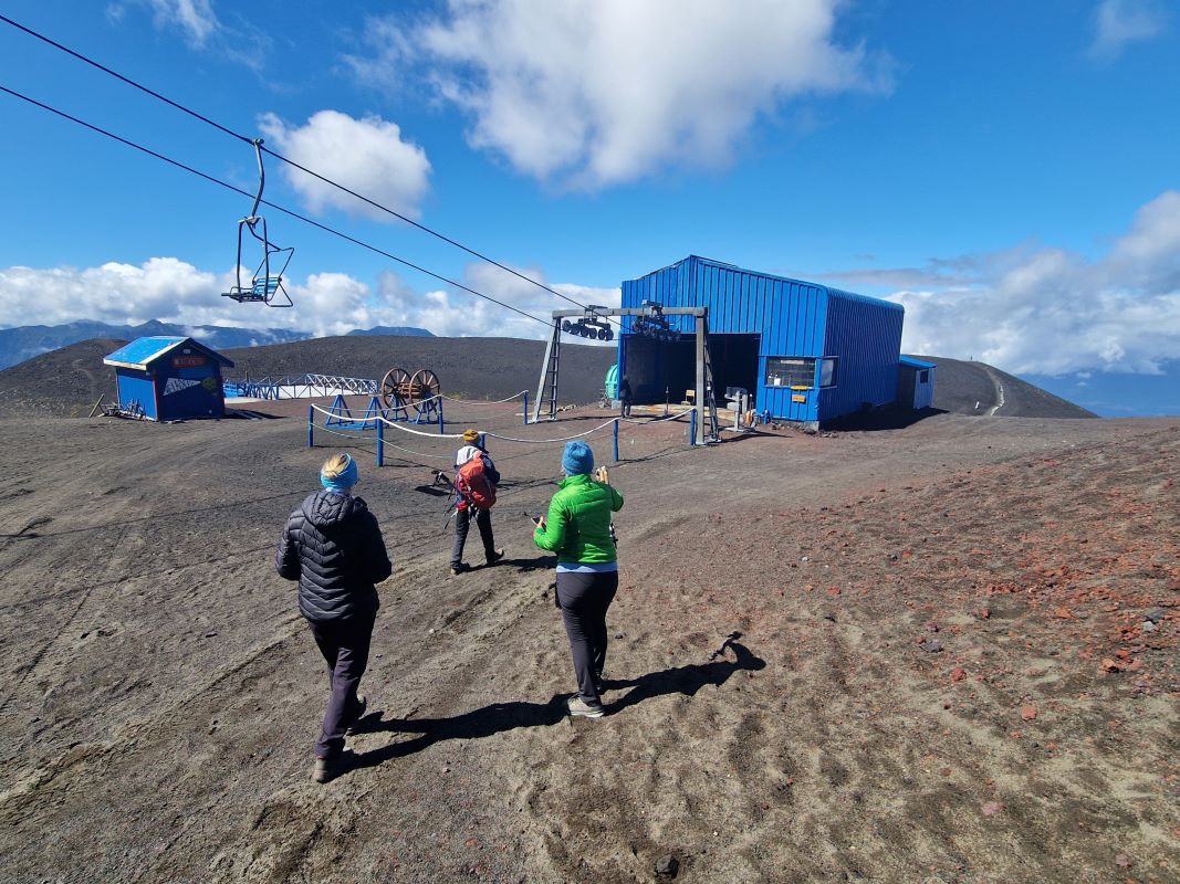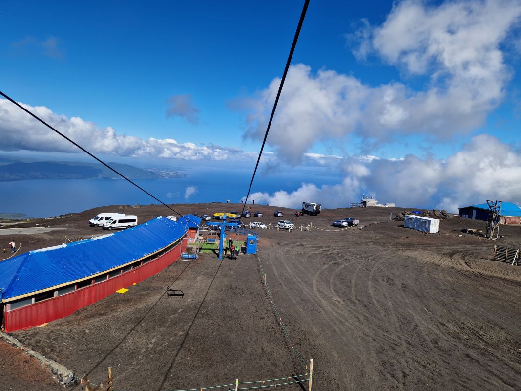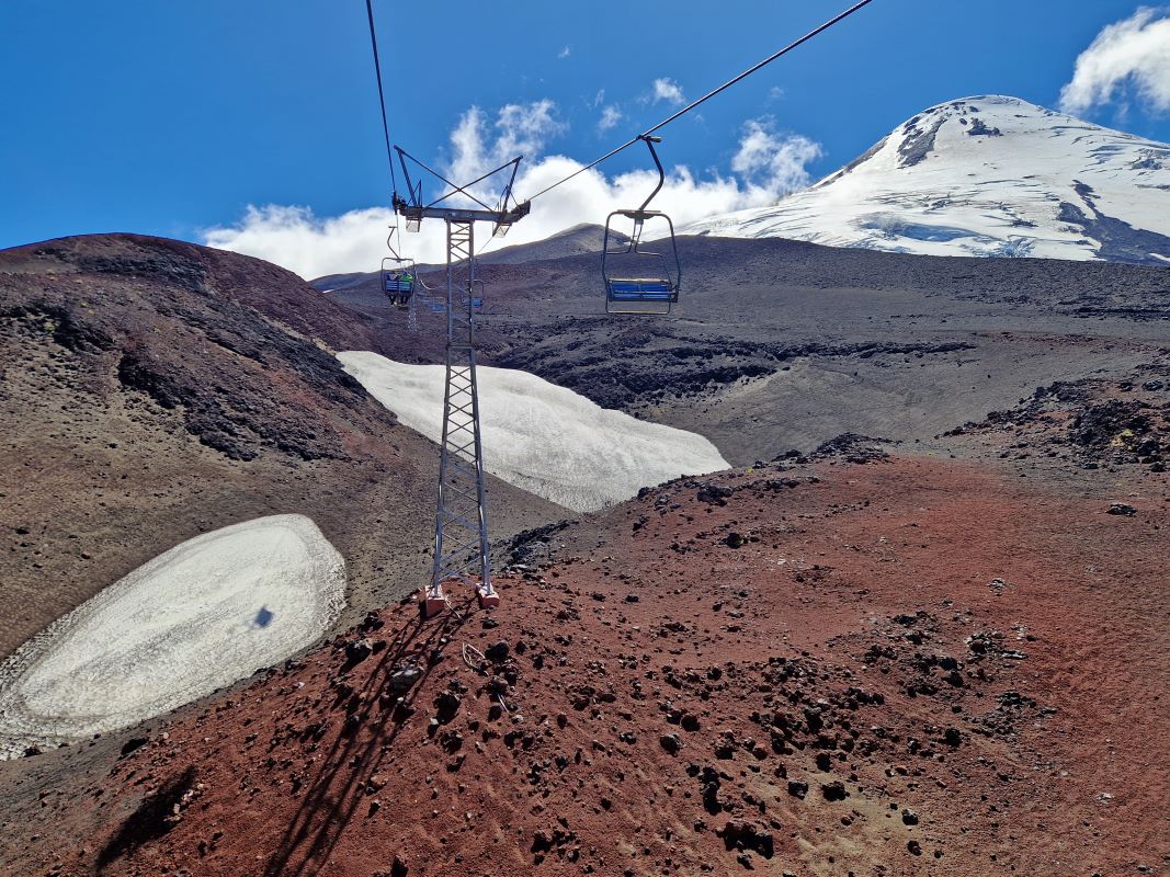 Ganz gemächlich zuckelt der betagte Lift in die Höhe. Übrigens ein Geschenk der Schweizer an die chilenischen Alpin-Kollegen. Laufen wäre fast schneller gewesen…aber besser schlecht gefahren, als gut gelaufen. Nach einem kurzen Aufstieg zum Gletscher, wandern wir am Rand einer der kleinen Nebenkrater zurück zum Parkplatz.