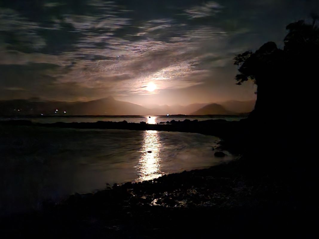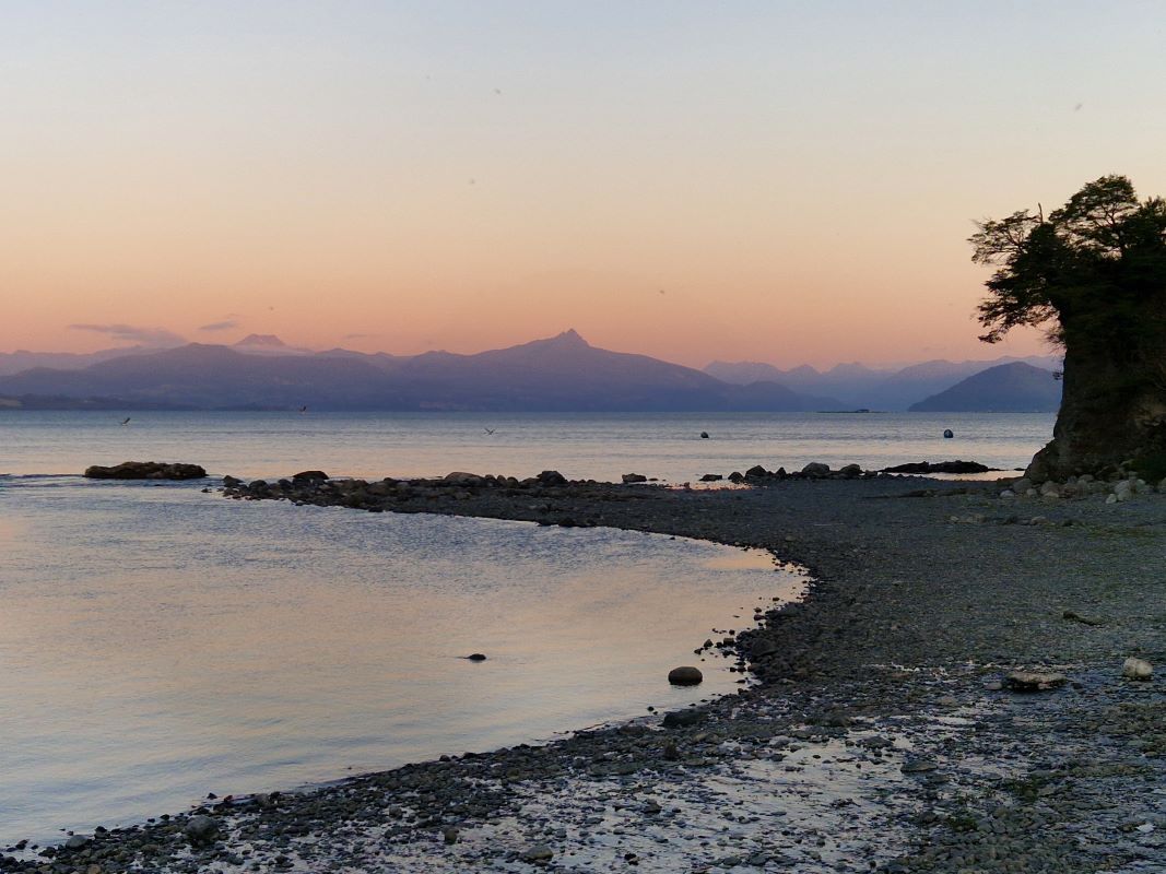 Mit der mittlerweile bewährten Abfahrtechnik (2. Gang Allrad, Motorbremse) schleichen wir unsere bisher steilste Straße wieder gen Tal und finden nach etwas Suche einen tollen Stellplatz am Lago Rupanco. Bis zum Abend geben sich um uns herum chilenische Rentnerpaare, die ihre Siesta in der Sonne verbringen, und einheimische Angler ein Stelldichein. Anscheinend sind die in den See strömenden, glasklaren Bergbäche ein Eldorado für Forellen. Wir baden mal wieder im See und fühlen uns verjüngt und frisch wie der junge Morgentau. Bei einem malerischen Sonnenunter- und Mondaufgang sitzen wir zusammen mit Petra und Elmar (blaues Steyr-LKW-Mobil) aus Bonn am Wasser und erzählen uns gegenseitig unsere Reisegeschichten, bis es uns allen trotz dicker Jacken doch zu kalt wird. Also ab ins Bett; spät ist es geworden.