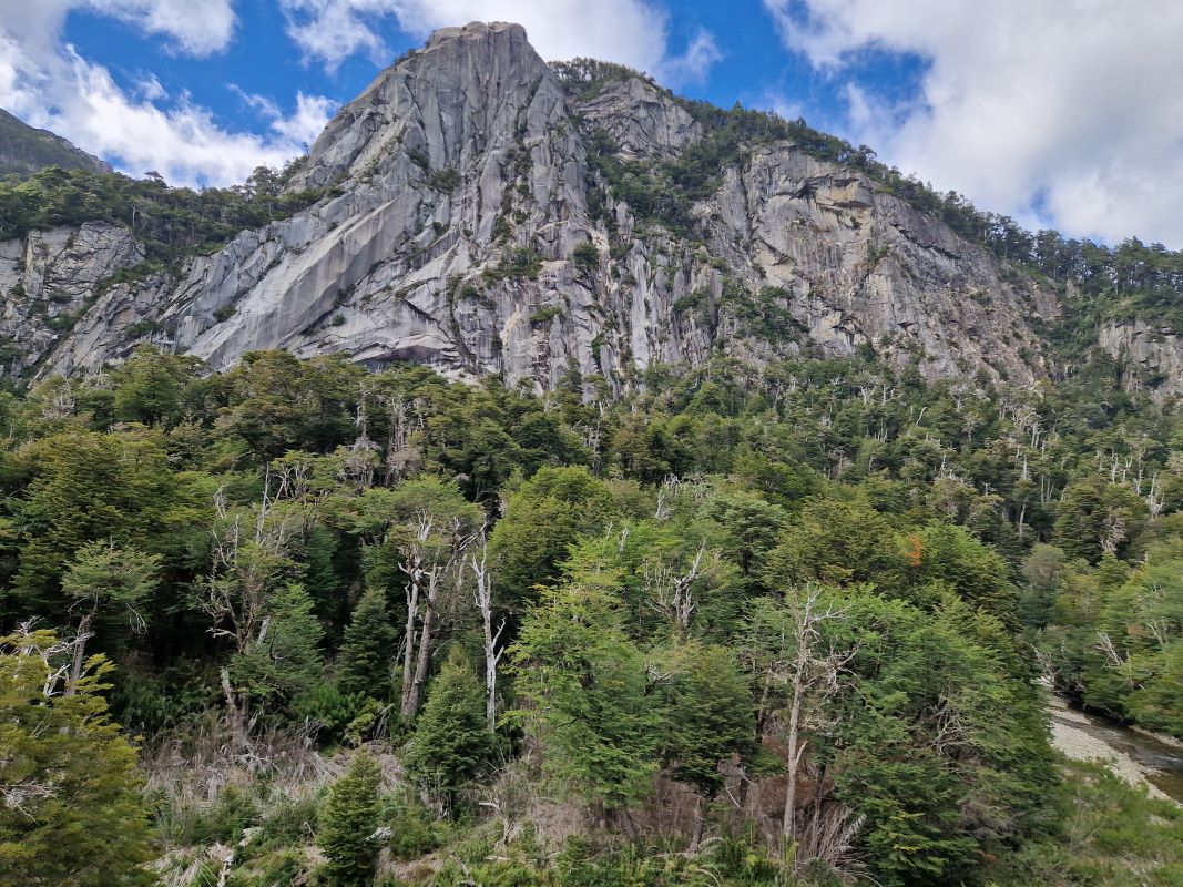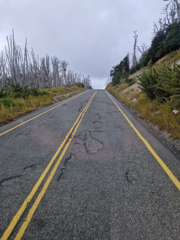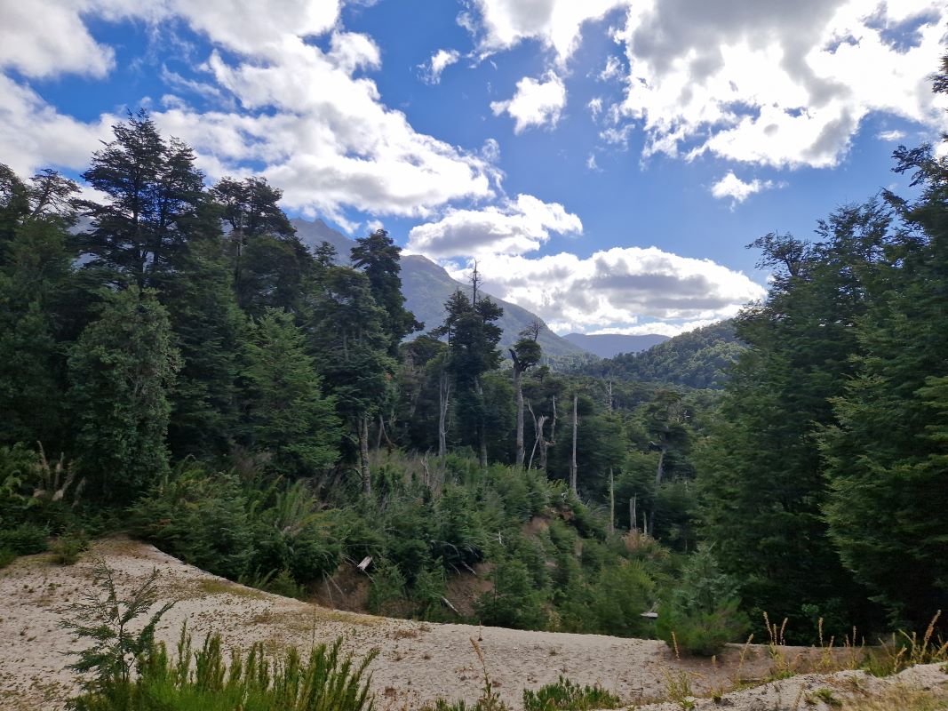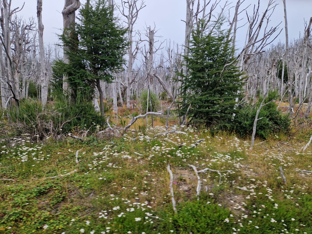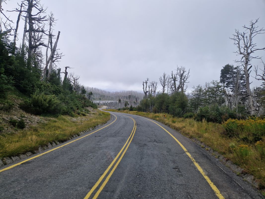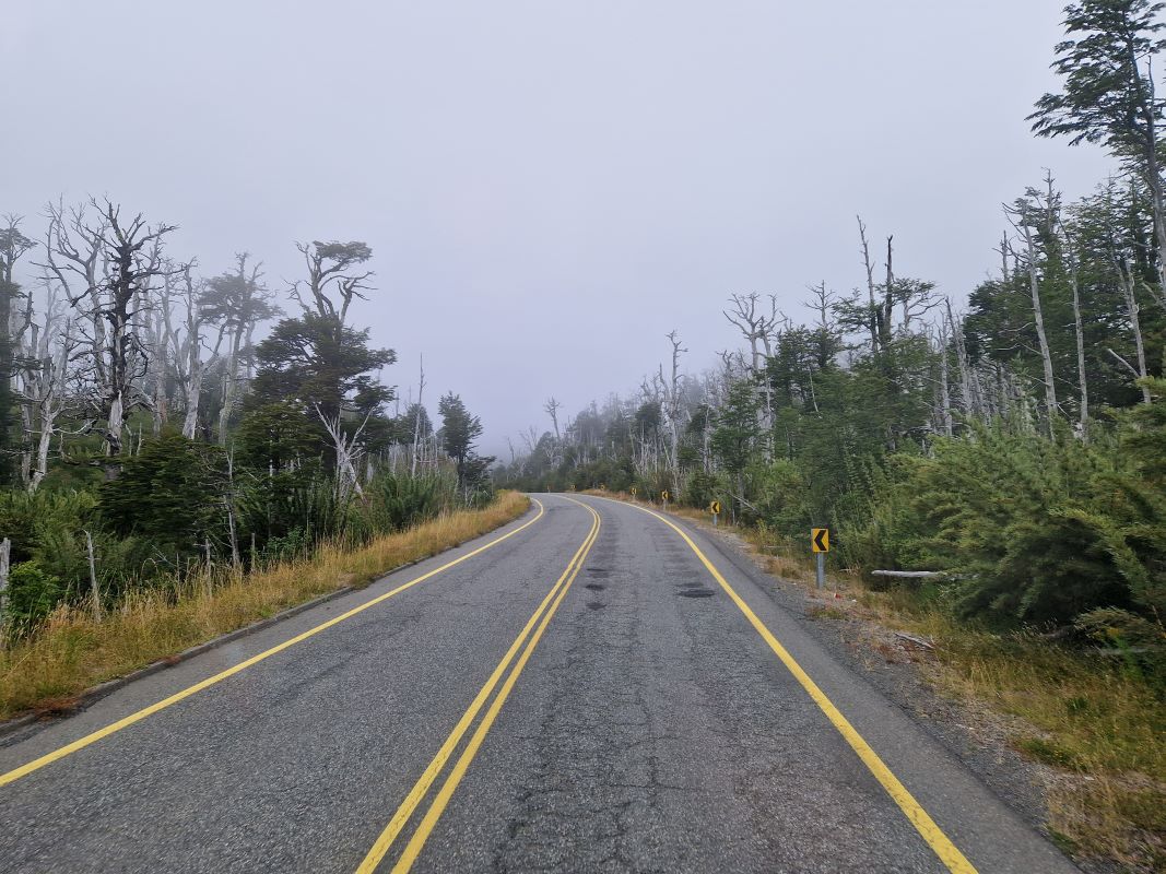 Wir passieren auf dem Weg hinauf zum 1308m hohen Pass erst eine tolle, nordpatagonische Dschungel-, dann eine Vulkan- und später eine bizarre Nebellandschaft, in der die vom letzten Ausbruch abgestorbenen Bäume wie bizarre Skulpturen in den Himmel ragen.