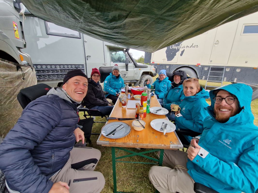 So unvermittelt wollen wir uns als Reisegruppe dann doch nicht auflösen und daher beschließen wir, den letzten gemeinsamen Abend bei einem Abschiedsgrillen mit der Antarktisgruppe auf dem Camping Municipal zu verbringen. Schnell ist die Wagenburg gebaut. Und nun kommt unsere Bierbankgarnitur endlich zum Einsatz (hat sich also doch gelohnt, das schwere Ding mitzuschleppen). Mit etwas Improvisationswillen und unter großem Gelächter der Beistehenden spannen wir eine große Plane zwischen den Autos gegen Wind und Regen und stoßen in dicke Jacken gehüllt auf die vergangenen wunderschönen Tage an.
