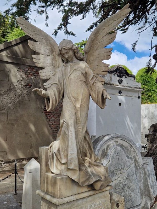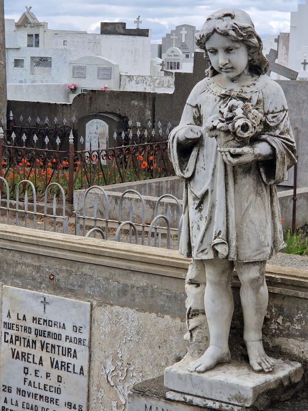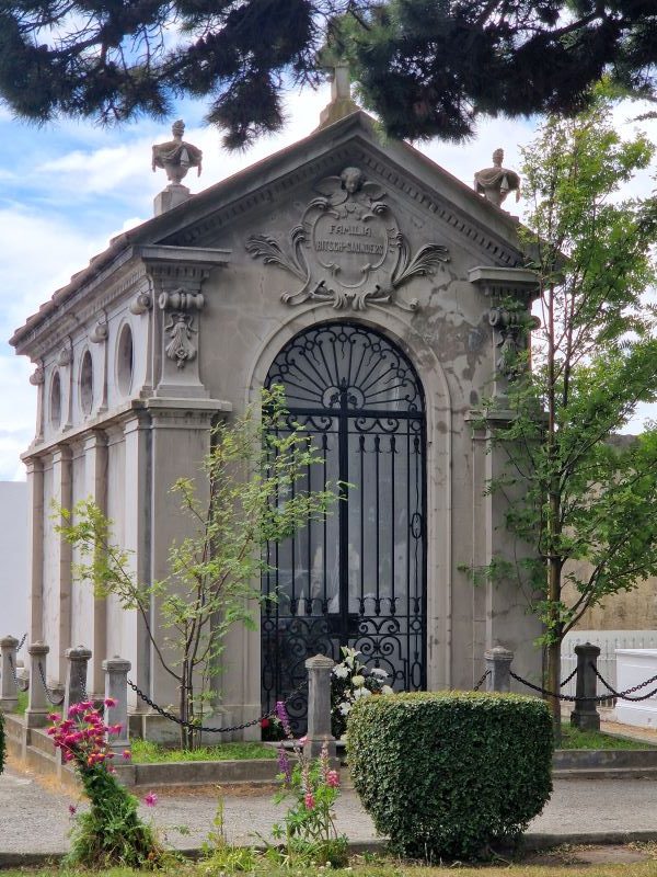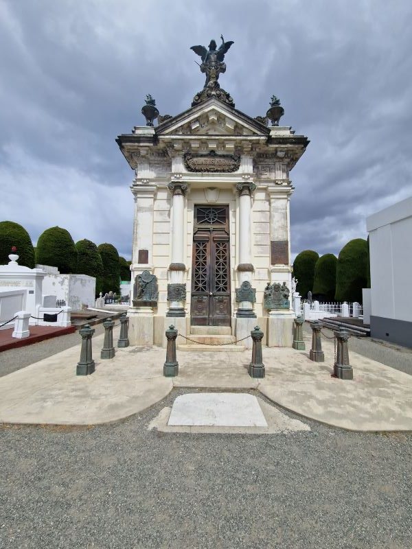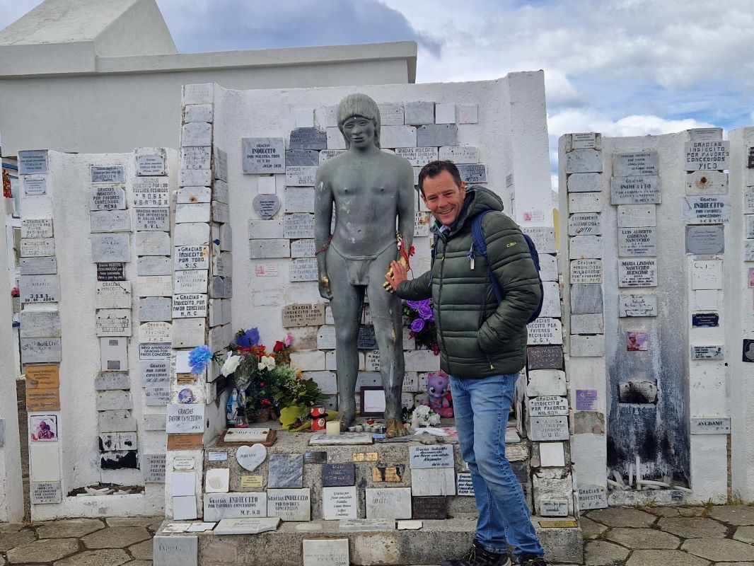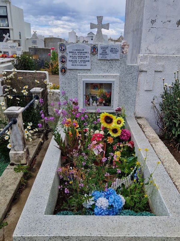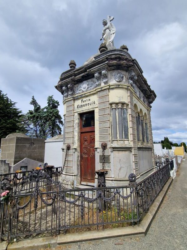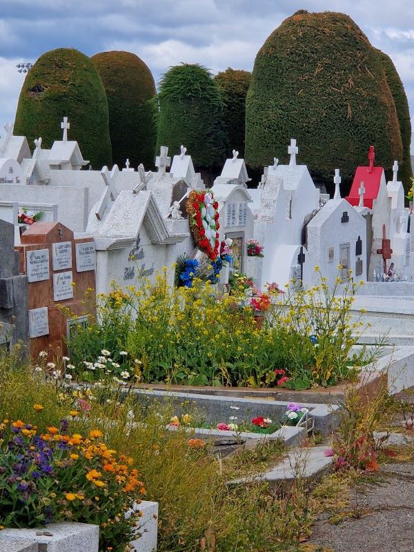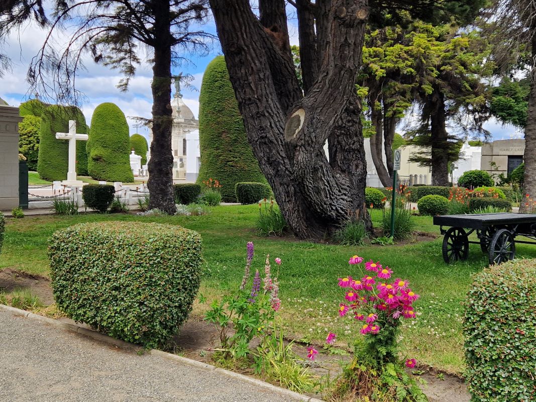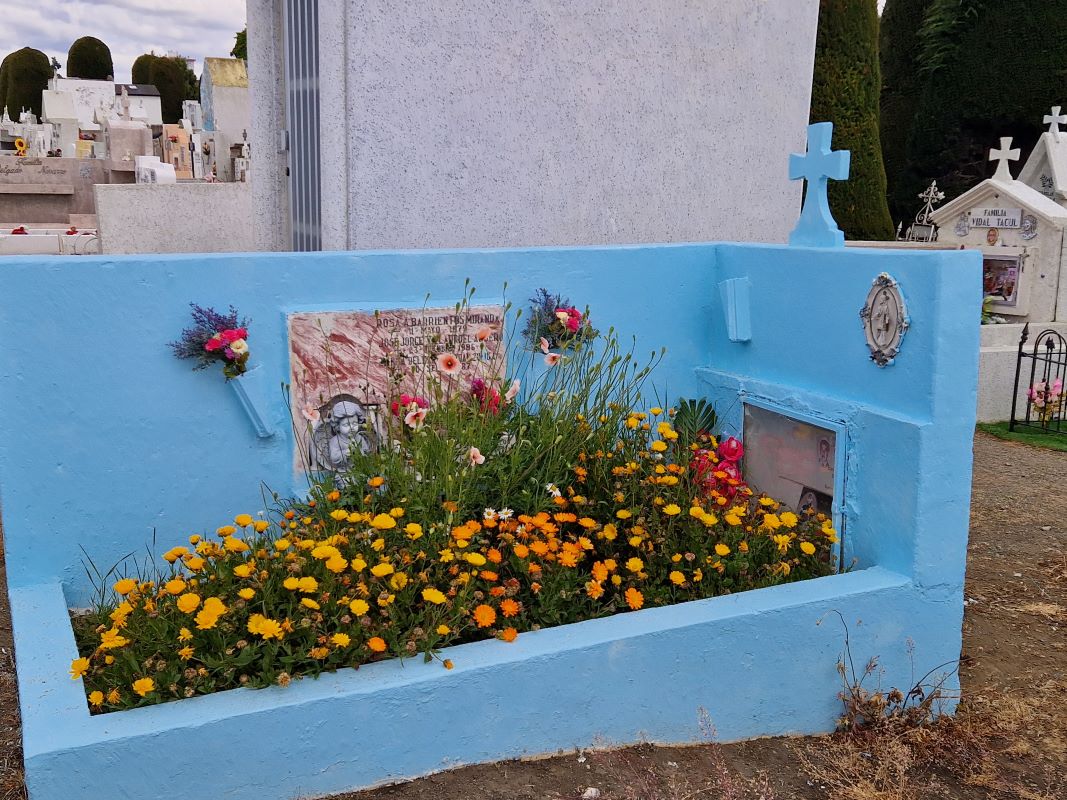 In Punta Arenas besorgen wir uns chilenische SIM-Karten, um wieder am world-wide-web teilnehmen zu können, probieren ein angeblich preisgekröntes Choripan mit Bananenmilch (an dem Kiosk stehen die Leute Schlange) – naja, wir hatten was anderes erwartet – und besuchen den Friedhof „Sara Braun“. Ähnlich wie der Friedhof La Recoleta in Buenos Aires, nur in klein und viel bunter. Hier findet im Unterschied zu La Recoleta nämlich immer noch „Leben“ statt (kann man das so sagen?); viele Gräber und Mausoleen sind mit frischen Blumen im Andenken an die schon vorausgegangenen Angehörigen geschmückt und bepflanzt und verleihen diesem Ort des Gedenkens eine sehr „lebendige“ und farbenfrohe Atmosphäre.