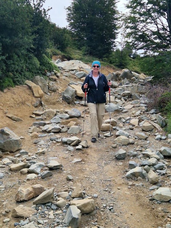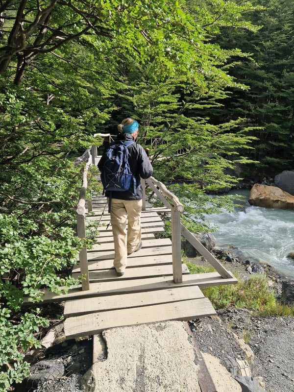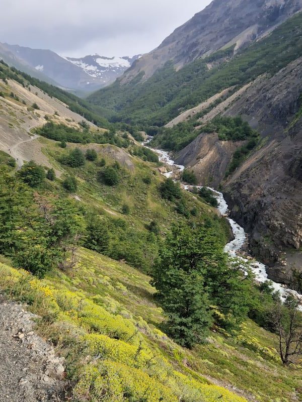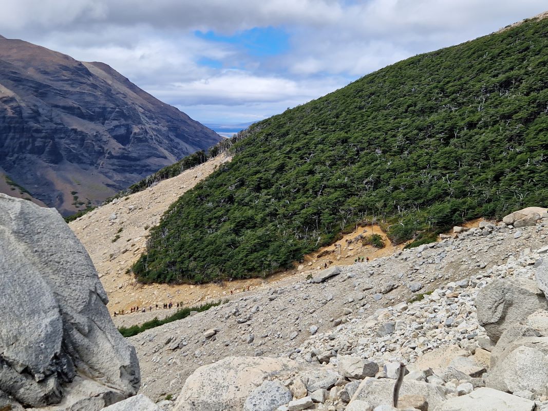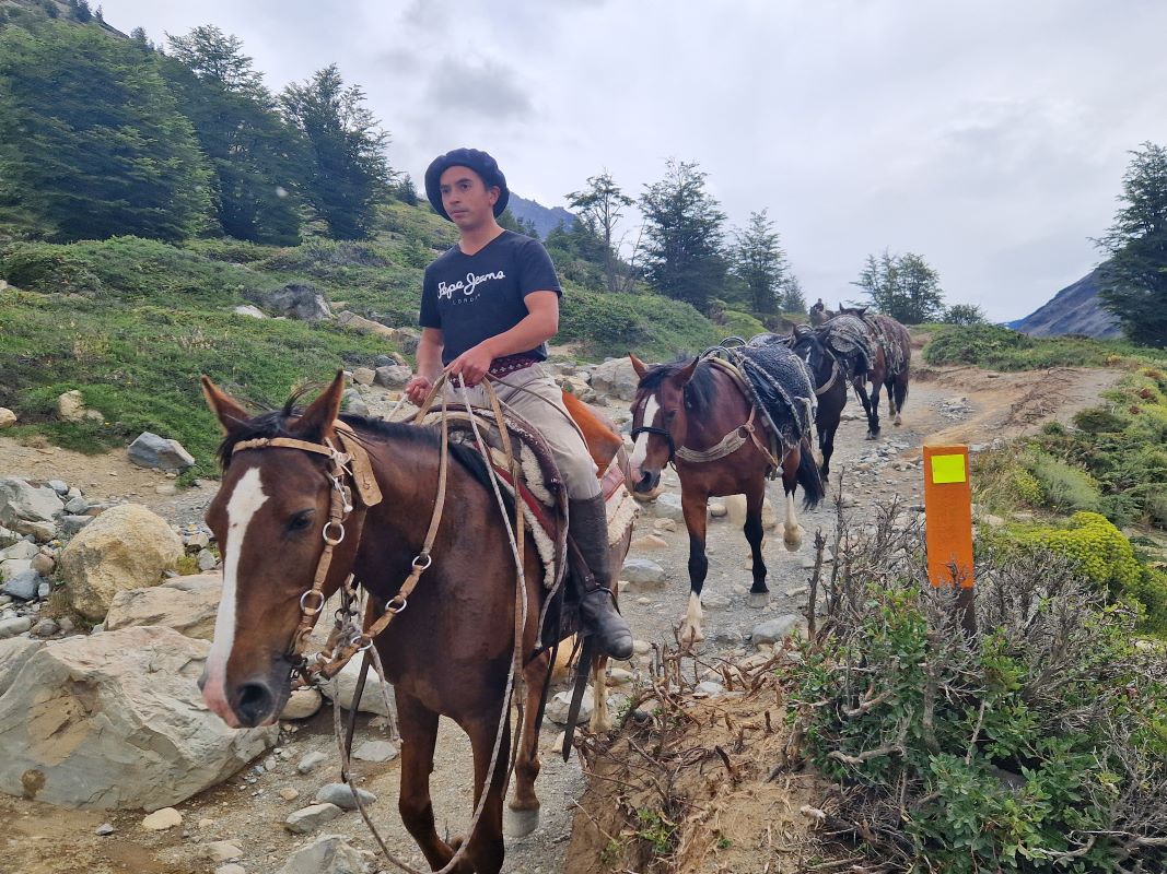Der Weg ist Teil eines 7-Tage-Langstrecken-Wanderweges (dem sog. O-Trek; weil er sich wie ein „O“ um das Paine-Bergmassiv schlängelt; die kürzere 5-Tages-Teilvariante wird als W-Trek bezeichnet). In jeweils Tagesetappen-Entfernung gibt es für die Wanderer bewirtete refugios (ähnlich den Berghütten in den Alpen) zum Übernachten und Essen. Aufgrund ihrer abgeschiedenen Lage können die Hütten nur mit von Gauchos angeführten Pferdekarawanen versorgt werden. Wir sind erstaunt über die Trittsicherheit dieser uns überholenden Tiere auf dem mit z.T. großen Steinen übersäten Geröllwegen.