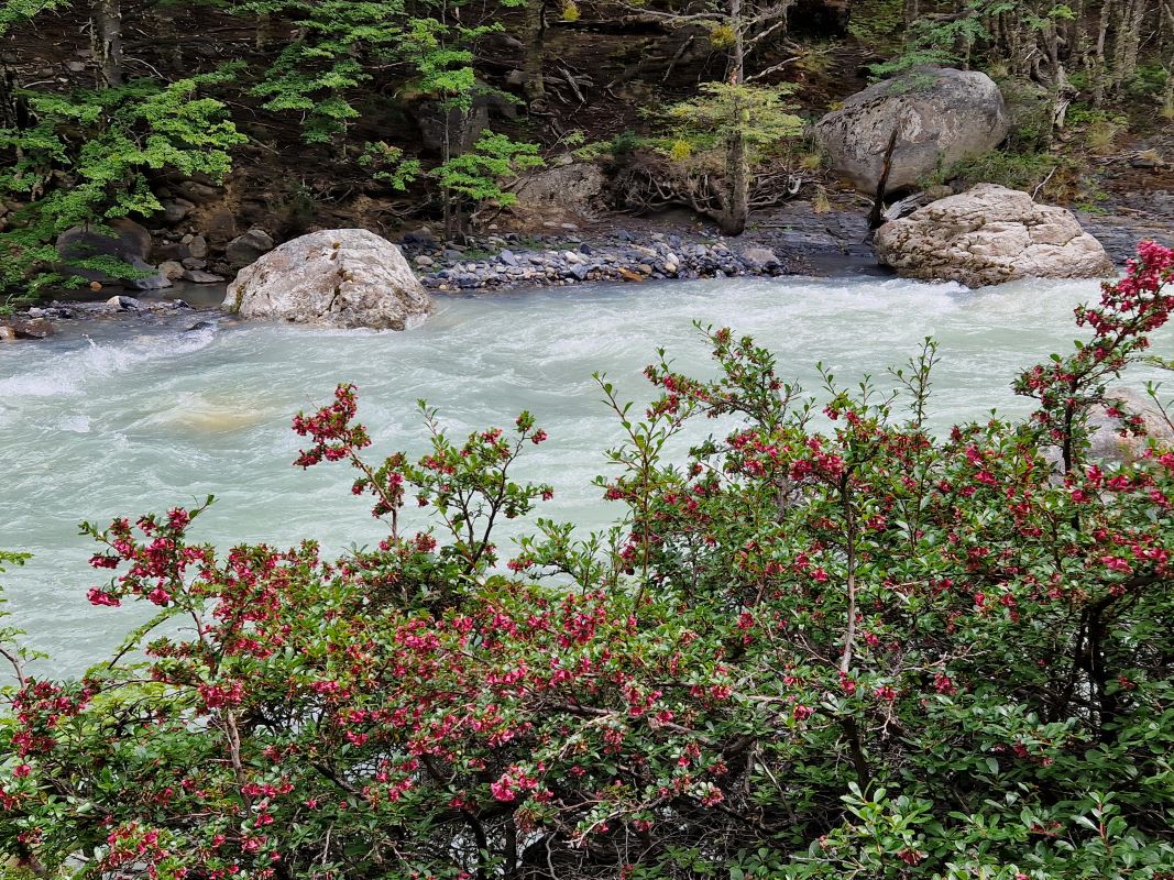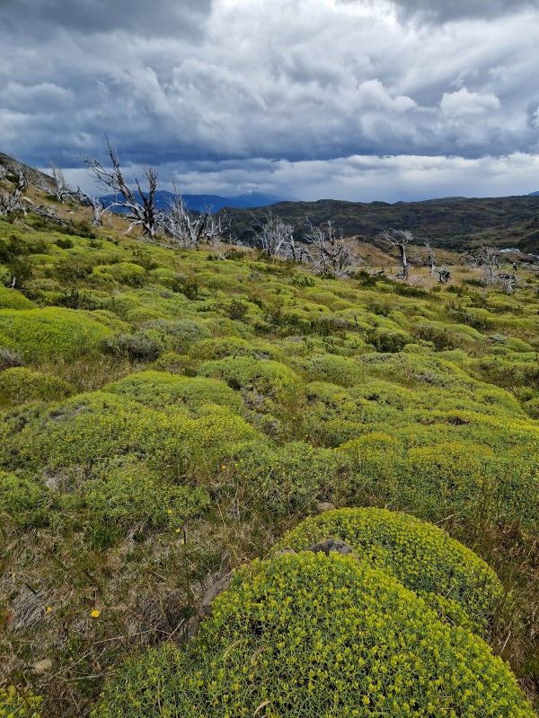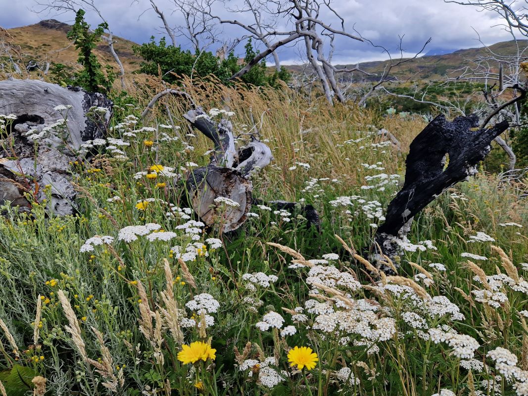 Wir durchwandern verschiedene Vegetationsgürtel auf dem Weg in die Höhe. Zuerst noch vom magellanischen Wald mit seinen Südbuchenarten dominiert, über Strauchgewächszonen (typisch hier: Berberitze und der Calafate-Strauch) bis über die aus Moosarten bestehende und mit Dotterblumen- und Fingerhutblüten besternte Tundra Magellánica hinaus.